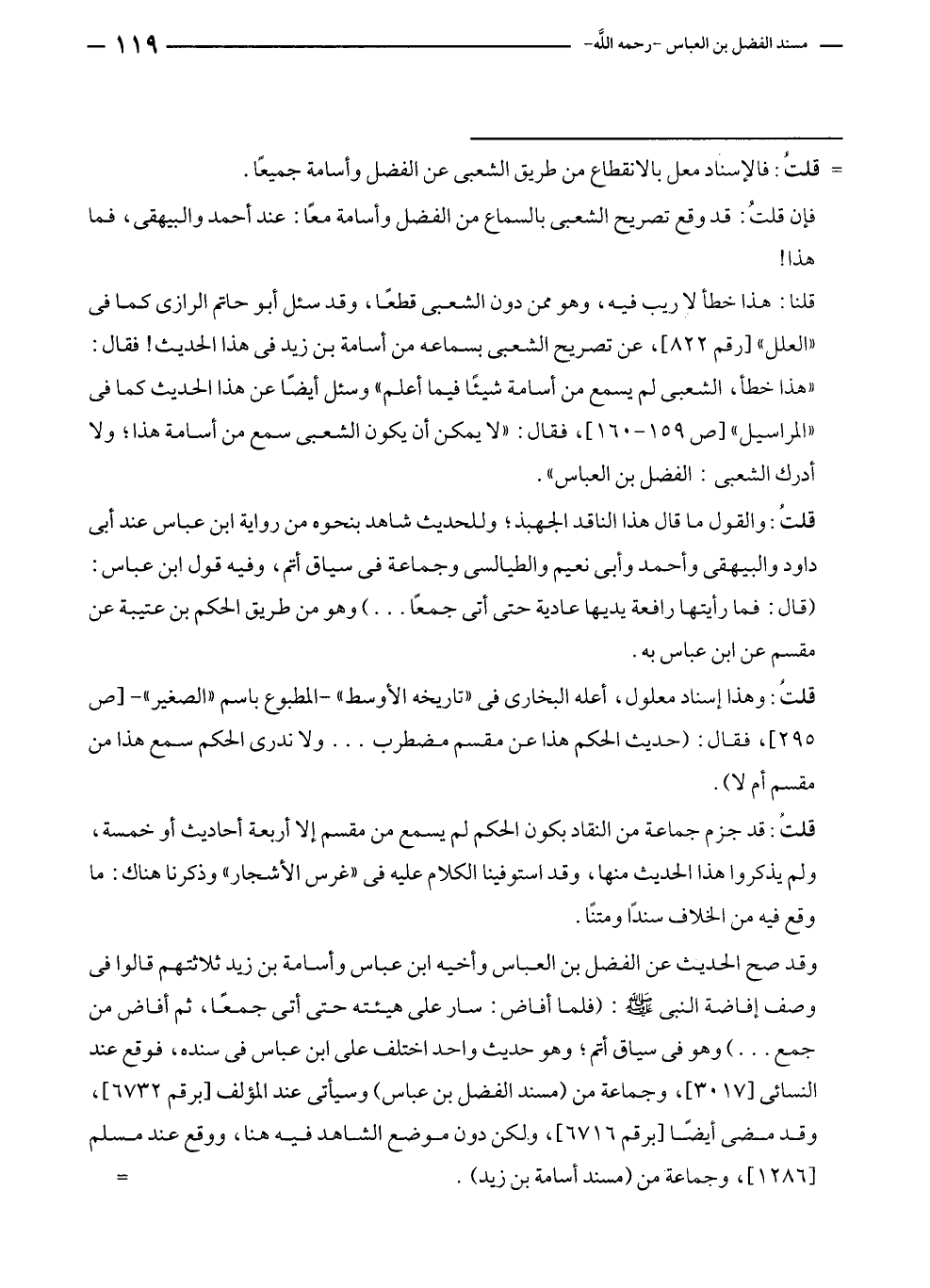 قلنا: هذا خطأ لا ريب فيه، وهو ممن دون الشعبي قطعًا، وقد سئل أبو حاتم الرازي كما في "العلل" [رقم ٨٢٢]، عن تصريح الشعبي بسماعه من أسامة بن زيد في هذا الحديث! فقال: "هذا خطأ، الشعبي لم يسمع من أسامة شيئًا فيما أعلم" وسئل أيضًا عن هذا الحديث كما في "المراسيل" [ص ١٥٩ - ١٦٠]، فقال: "لا يمكن أن يكون الشعبي سمع من أسامة هذا؛ ولا أدرك الشعبي: الفضل بن العباس".