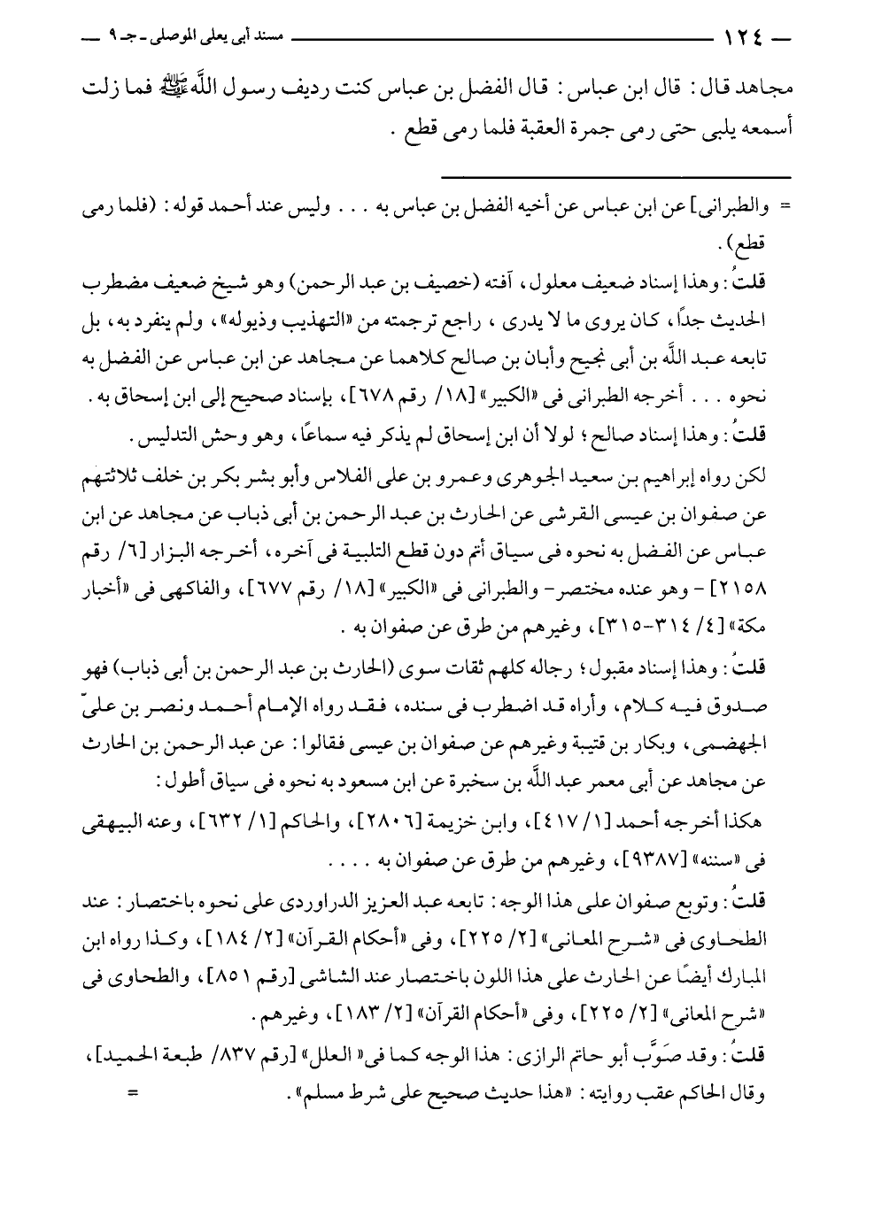 = والطبراني] عن ابن عباس عن أخيه الفضل بن عباس به ... وليس عند أحمد قوله: (فلما رمى قطع).