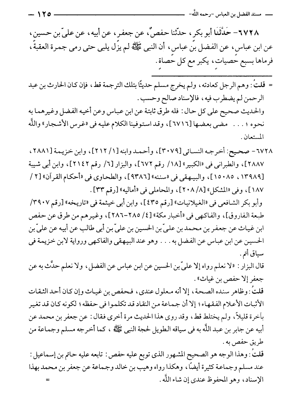 قلتُ: وظاهر سنده الصحة، إلا أنه معلول عندى، فحفص بن غياث وإن كان أحد الثقات الأثبات الأعلام الفقهاء؛ إلا أن جماعة من النقاد قد تكلموا في حفظه؛ لكونه كان قد تغير بآخرة قليلًا؛ ولم يختلط قط، وقد روى هذا الحديث مرة أخرى فقال: عن جعفر بن محمد عن أبيه عن جابر بن عبد الله به في سياقه الطويل لحجة النبي - صلى الله عليه وسلم -، كما أخرجه مسلم وجماعة من طريق حفص به.
