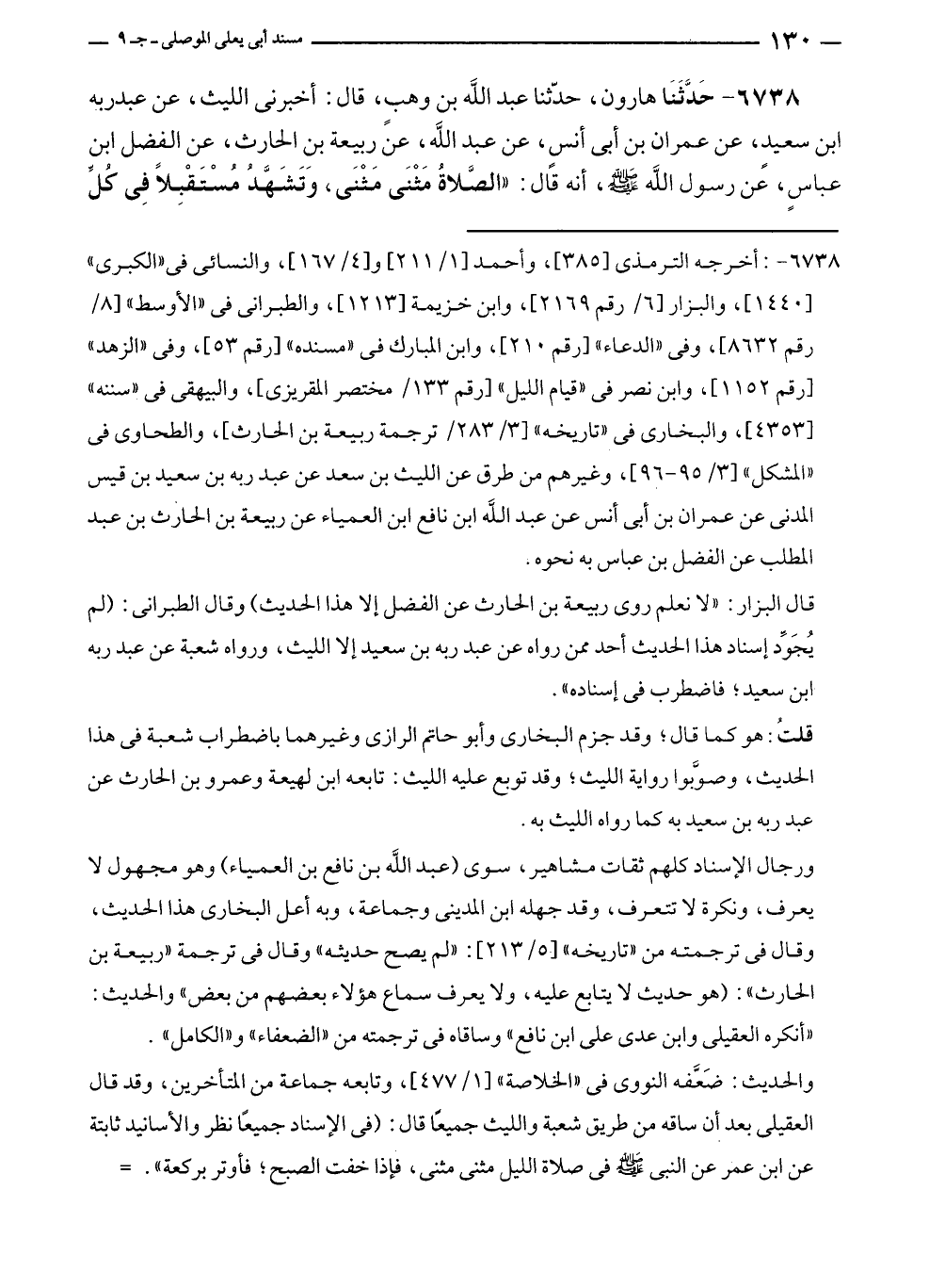 ٦٧٣٨ - حَدَّثَنَا هارون، حدّثنا عبد الله بن وهبٍ، قال: أخبرني الليث، عن عبد ربه بن سعيدٍ، عن عمران بن أبي أنس، عن عبد الله، عن ربيعة بن الحارث، عن الفضل بن عباسٍ، عن رسول الله - صلى الله عليه وسلم -، أنه قال: "الصَّلاةُ مَثْنَى مَثْنَى، وَتَشَهَّدُ مُسْتَقْبِلًا فِي كُلِّ