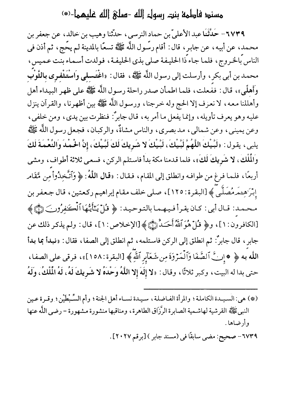 ٦٧٣٩ - حَدَّثَنَا عبد الأعلى بن حمادٍ النرسي، حدّثنا وهيب بن خالدٍ، عن جعفر بن محمدٍ، عن أبيه، عن جابرٍ، قال: أقام رسول الله - صلى الله عليه وسلم - تسعًا بالمدينة لم يحج، ثم أذن في الناس بالخروج، فلما جاء ذا الحليفة صلى بذى الحليفة، فولدت أسماء بنت عميسٍ، محمد بن أبي بكرٍ، وأرسلت إلى رسول الله - صلى الله عليه وسلم -، فقال: "اغْتَسِلِي وَاسْتَثْفِرِي بِالثَّوْبِ وَأَهِلِّي"، قال: ففعلت، فلما اطمأن صدر راحلة رسول الله - صلى الله عليه وسلم - على ظهر البيداء أهل وأهللنا معه، لا نعرف إلا الحج وله خرجنا، ورسول الله - صلى الله عليه وسلم - بين أظهرنا، والقرآن ينزل عليه وهو يعرف تأويله، وإنما يفعل ما أمر به، قال جابرٌ: فنظرت بين يدى، ومن خلفي، وعن يميني، وعن شمالي، مد بصرى، والناس مشاةٌ، والركبان، فجعل رسول الله - صلى الله عليه وسلم - يلبى، يقول: "لَبَّيْكَ اللَّهُمَّ لَبَّيْكَ، لَبَّيْكَ لا شَرِيكَ لَكَ لَبَّيْكَ، إِنَّ الحمْدَ وَالنِّعْمَةَ لَكَ وَالْمُلْك، لا شَرِيكَ لَكَ"، فلما قدمنا مكة بدأ فاستلم الركن، فسعى ثلاثة أطوافٍ، ومشى أربعًا، فلما فرغ من طوافه وانطلق إلى المقام، فقال: "قال الله: {وَاتَّخِذُوا مِنْ مَقَامِ إِبْرَاهِيمَ مُصَلًّى} [البقرة: ١٢٥]، صلى خلف مقام إبراهيم ركعتين، قال جعفر بن محمدٍ: قال أبي: كان يقرأ فيهما بالتوحيد: {قُلْ يَاأَيُّهَا الْكَافِرُونَ (١)} [الكافرون: ١]، و {قُلْ هُوَ اللَّهُ أَحَدٌ (١)} [الإخلاص: ١]، قال: ولم يذكر ذلك عن جابرٍ، قال جابرٌ: ثم انطلق إلى الركن فاستلمه، ثم انطلق إلى الصفا، فقال: "نبدأ بما بدأ الله به {إِنَّ الصَّفَا وَالْمَرْوَةَ مِنْ شَعَائِرِ اللَّهِ} [البقرة: ١٥٨] "، فرقى على الصفا، حتى بدا له البيت، وكبر ثلاثًا، وقال: "لا إِلَهَ إِلا اللَهُ وَحْدَهُ لا شَرِيكَ لَهُ، لَهُ الْمُلْكُ، وَلَهُ