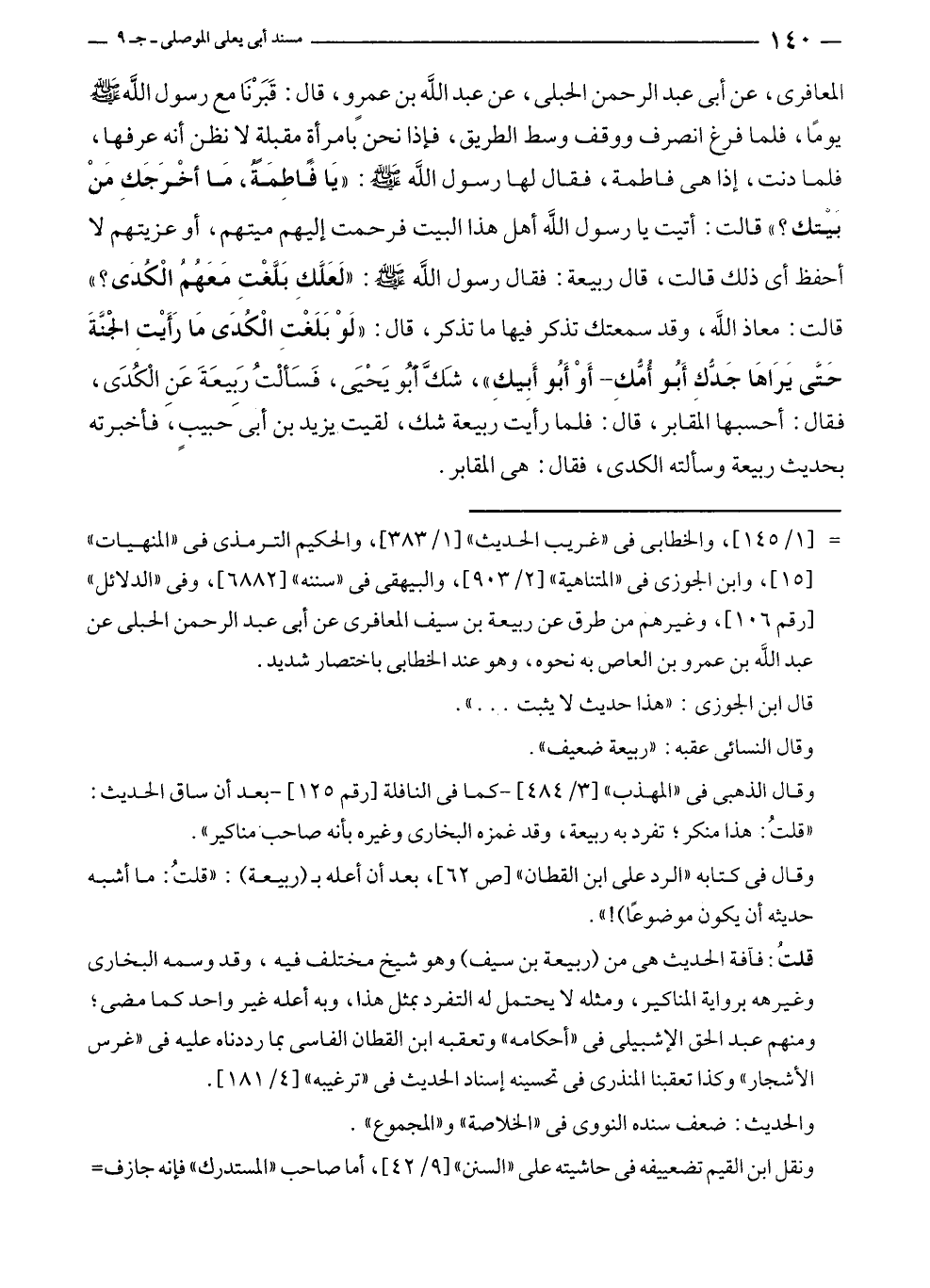 المعافري، عن أبي عبد الرحمن الحبلى، عن عبد الله بن عمرٍو، قال: قَبَرْنَا مع رسول الله - صلى الله عليه وسلم - يومًا، فلما فرغ انصرف ووقف وسط الطريق، فإذا نحن بامرأةٍ مقبلة لا نظن أنه عرفها، فلما دنت، إذا هي فاطمة، فقال لها رسول الله - صلى الله عليه وسلم -: "يَا فَاطِمَةُ، مَا أخْرَجَكِ مَنْ بَيْتك؟ " قالت: أتيت يا رسول الله أهل هذا البيت فرحمت إليهم ميتهم، أو عزيتهم لا أحفظ أي ذلك قالت، قال ربيعة: فقال رسول الله - صلى الله عليه وسلم -: "لَعَلَّكِ بَلَّغْتِ مَعَهُمُ الْكُدَى؟ " قالت: معاذ الله، وقد سمعتك تذكر فيها ما تذكر، قال: "لَوْ بَلَغْتِ الْكُدَى مَا رَأَيْتِ الجَنَّةَ حَتَّى يَرَاهَما جَدُّك أَبُو أُمُّكِ - أَوْ أَبُو أَبِيكِ"، شَكَّ أبُو يَحْيَى، فَسَألْتُ رَبيعَةَ عَن الْكُدَى، فقال: أحسبها المقابر، قال: فلما رأيت ربيعة شك، لقيت يزيد بن أبي حبيبٍ، فأخبرته بحديث ربيعة وسألته الكدى، فقال: هي المقابر.