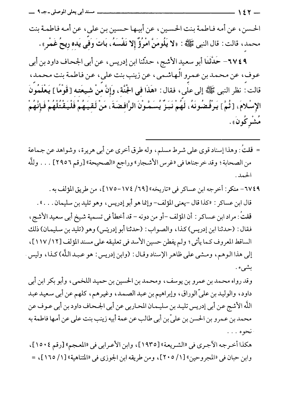 وقد رواه محمد بن عمرو بن يوسف، ومحمد بن الحسين بن حميد اللخمى، وأبو بكر بن أبى داود، والوليد بن عليّ الوراق، وإبراهيم بن عبد الصمد، وغيرهم، كلهم عن أبى سعيد عبد الله الأشج عن أبى إدريس تليد بن سليمان المحاربى عن أبى الجحاف داود بن أبى عوف عن محمد بن عمرو بن الحسن بن عليّ بن أبى طالب عن عمة أبيه زينب بنت على عن أمها فاطمة به نحوه ...