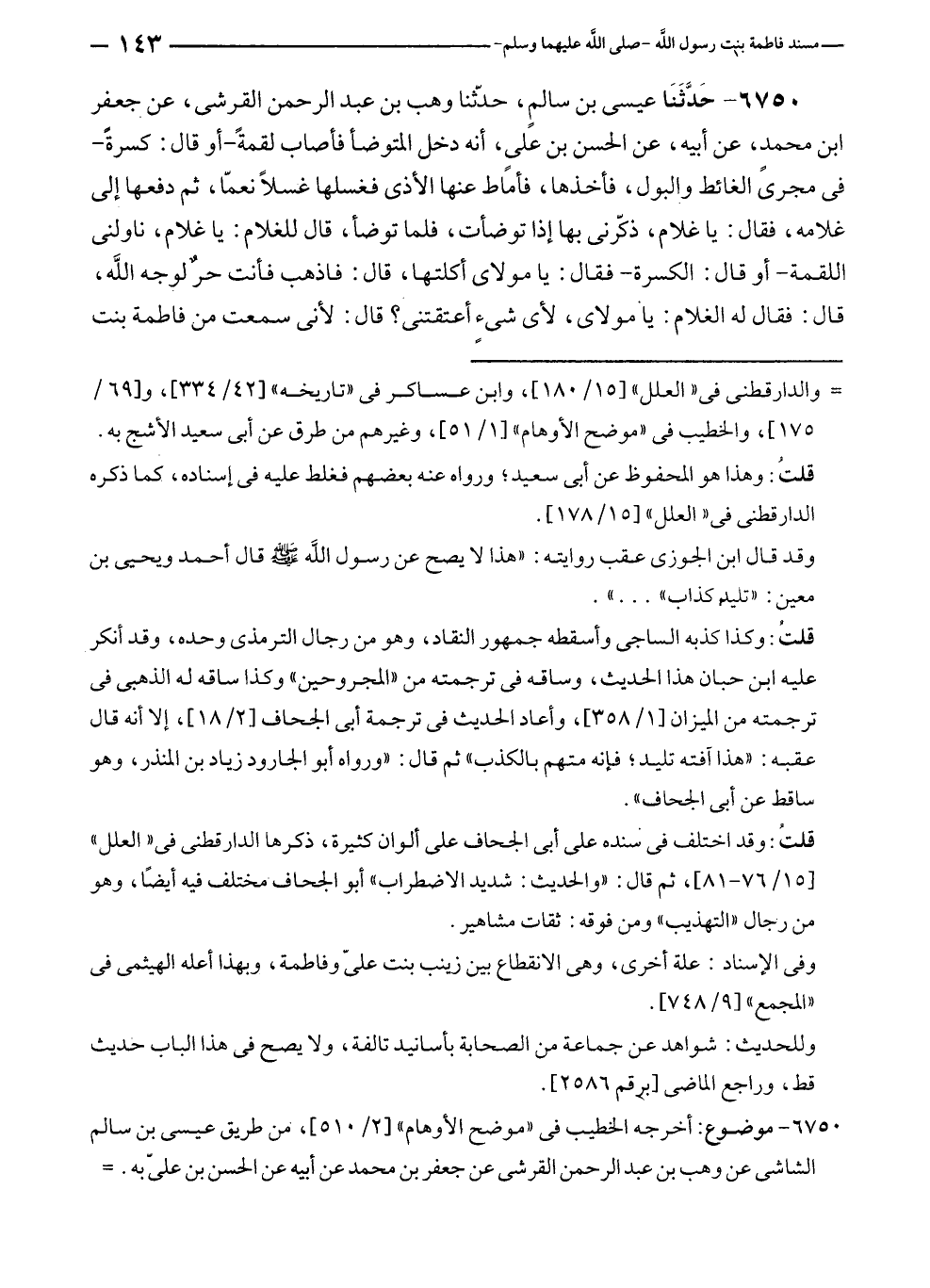 ٦٧٥٠ - حَدَّثَنَا عيسى بن سالمٍ، حدّثنا وهب بن عبد الرحمن القرشى، عن جعفر بن محمد، عن أبيه، عن الحسن بن على، أنه دخل المتوضأ فأصاب لقمةً - أو قال: كسرةً - في مجرى الغائط والبول، فأخذها، فأماط عنها الأذى فغسلها غسلًا نعمّا، ثم دفعها إلى غلامه، فقال: يا غلام، ذكّرنى بها إذا توضأت، فلما توضأ، قال للغلام: يا غلام، ناولنى اللقمة - أو قال: الكسرة - فقال: يا مولاى أكلتها، قال: فاذهب فأنت حرٌ لوجه الله، قال: فقال له الغلام: يا مولاى، لأى شئٍ أعتقتنى؟ قال: لأنى سمعت من فاطمة بنت