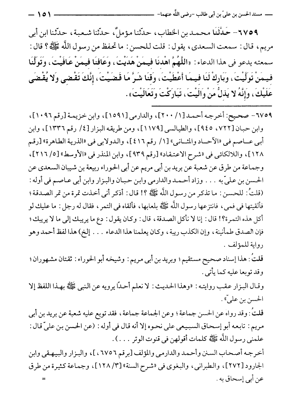 ٦٧٥٩ - صحيح: أخرجه أحمد [١/ ٢٠٠]، والدارمى [١٥٩١]، وابن خزيمة [رقم ١٠٩٦]، وابن حبان [٧٢٢، ٩٤٥]، والطيالسى [١١٧٩]، ومن طريقه البزار [٤/ رقم ١٣٣٦]، وابن أبى عاصم في "الآحاد والمثانى" [١/ رقم ٤١٦]، والدولابى في "الذرية الطاهرة" [رقم ١٢٨]، واللالكائى في "شرح الاعتقاد" [رقم ٩٣٩]، وابن المنذر في "الأوسط" [٥/ ٢١٦]، وجماعة من طرق عن شعبة عن بريد بن أبى مريم عن أبى الحوراء ربيعة بن شيبان السعدى عن الحسن بن عليّ به ... وزاد أحمد والدارمى وابن حبان والبزار وابن أبى عاصم في أوله: (قلتُ: للحسن: ما تذكر من رسول الله - صلى الله عليه وسلم -؟! قال: أذكر أنى أخذت تمرة من تمر الصدقة؛ فألقيتها في فمى، فانتزعها رسول الله - صلى الله عليه وسلم - بلعابها، فألقاه في التمر، فقال له رجل: ما عليك لو أكل هذه التمرة؟! قال: إنا لا نأكل الصدقة، قال: وكان يقول: دع ما يريبك إلى ما لا يريبك؛ فإن الصدق طمأنينة، وإن الكذب ريبة، وكان يعلمنا هذا الدعاء ... إلخ) هذا لفظ أحمد وهو رواية للمؤلف.