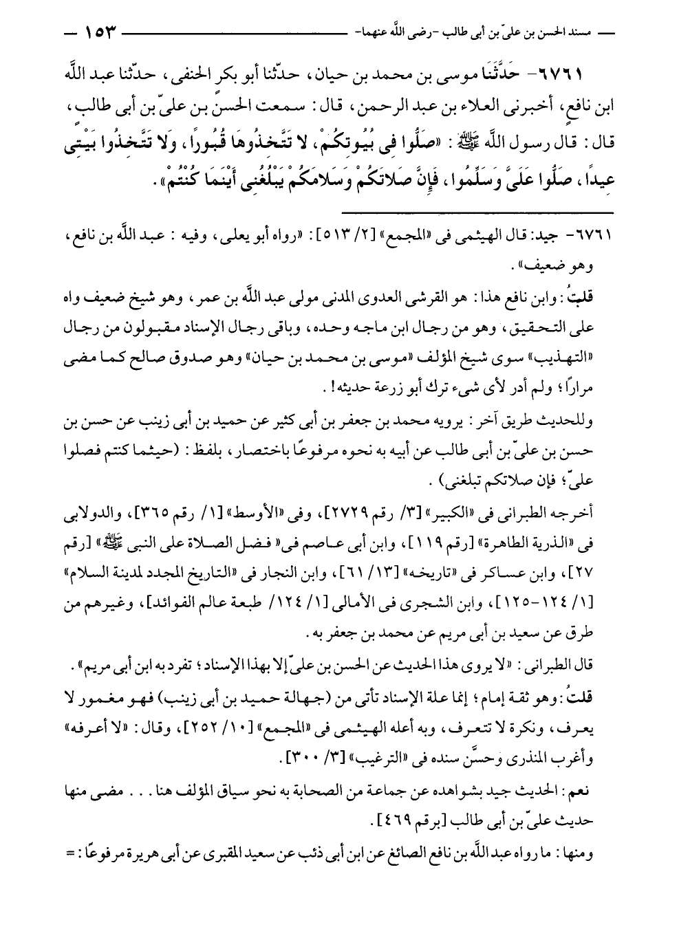 ٦٧٦١ - حَدَّثَنا موسى بن محمد بن حيان، حدّثنا أبو بكرٍ الحنفى، حدّثنا عبد الله بن نافعٍ، أخبرنى العلاء بن عبد الرحمن، قال: سمعت الحسن بن عليّ بن أبى طالب، قال: قال رسول الله - صلى الله عليه وسلم -: "صَلُّوا فِي بُيُوتِكمْ، لا تَتَّخِذوهَا قُبُورًا، وَلا تَتَّخِذوا بَيْتى عِيدًا، صَلُّوا عَلَيَّ وَسَلِّموا، فَإن صَلاتَكمْ وَسَلامَكُمْ يَبْلُغُنِى أَيْنَمَا كُنْتُمْ".