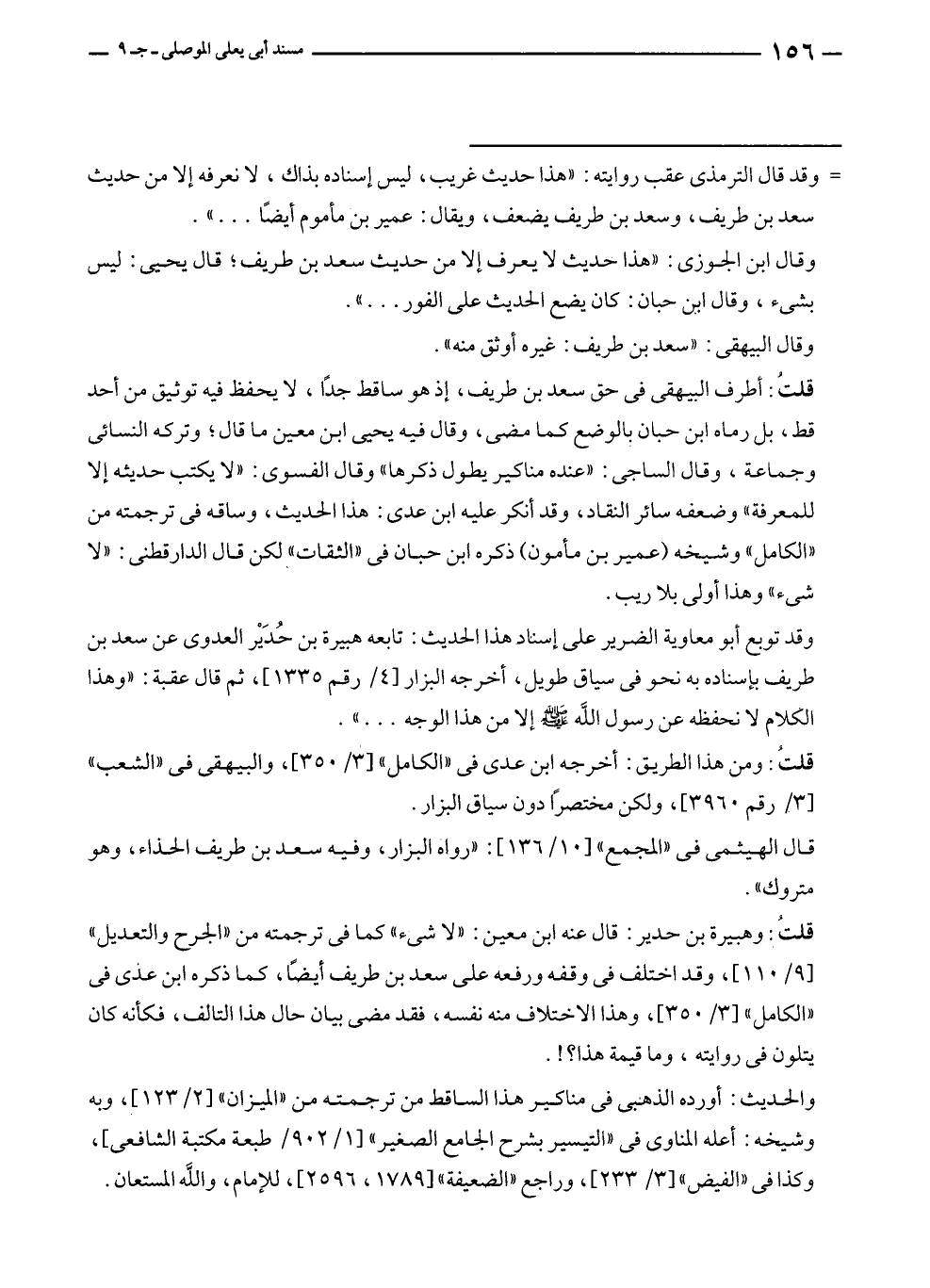 قلتُ: أطرف البيهقى في حق سعد بن طريف، إذ هو ساقط جدًّا، لا يحفظ فيه توثيق من أحد قط، بل رماه ابن حبان بالوضع كما مضى، وقال فيه يحيى ابن معين ما قال؛ وتركه النسائي وجماعة، وقال الساجى: "عنده مناكير يطول ذكرها" وقال الفسوى: "لا يكتب حديثه إلا للمعرفة" وضعفه سائر النقاد، وقد أنكر عليه ابن عدى: هذا الحديث، وساقه في ترجمته من "الكامل" وشيخه (عمير بن مأمون) ذكره ابن حبان في "الثقات" لكن قال الدارقطنى: "لا شئ" وهذا أولى بلا ريب.