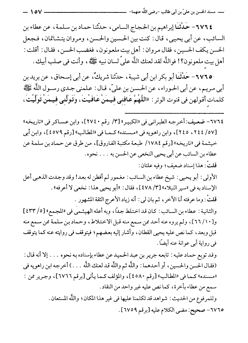 ٦٧٦٥ - حَدَّثَنَا أبو بكر بن أبى شيبة، حدّثنا شريكٌ، عن أبى إسحاق، عن بريد بن أبى مريم، عن أبى الحوراء، عن الحسن بن عليّ، قال: علمنى جدى رسول الله - صلى الله عليه وسلم - كلماتٍ أقولهن في قنوت الوتر: "اللَّهُمَّ عَافِنِى فِيمَنْ عَافَيْتَ، وَتَوَلَّنِى فِيمَنْ تَوَلَّيْتَ،