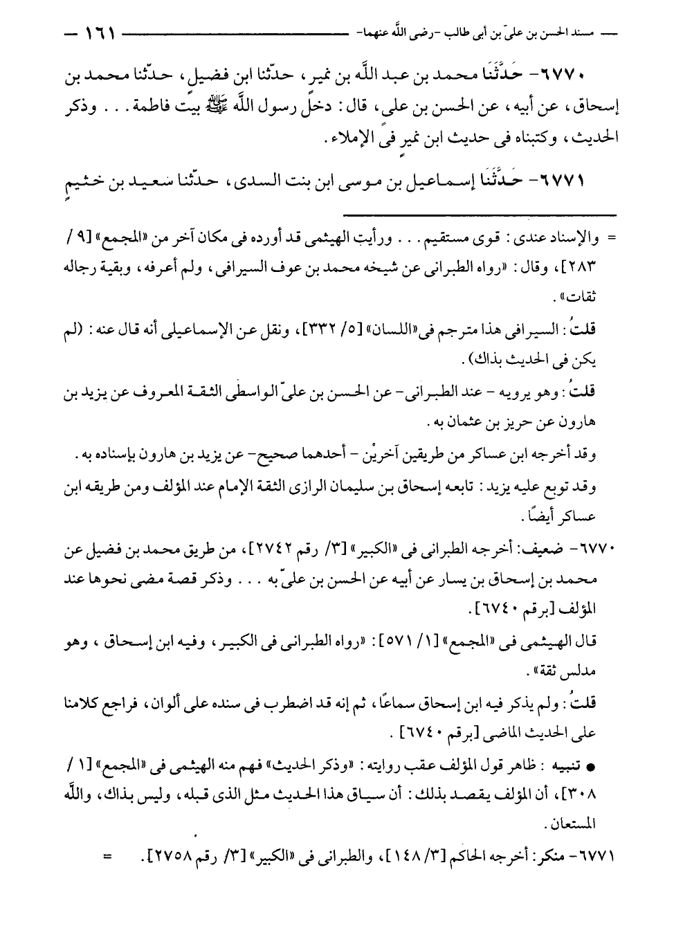 ٦٧٧٠ - حَدَّثَنَا محمد بن عبد الله بن نمير، حدّثنا ابن فضيلٍ، حدّثنا محمد بن إسحاق، عن أبيه، عن الحسن بن علي، قال: دخلً رسول الله - صلى الله عليه وسلم - بيت فاطمة ... وذكر الحديث، وكتبناه في حديث ابن نميرٍ في الإملاء.
