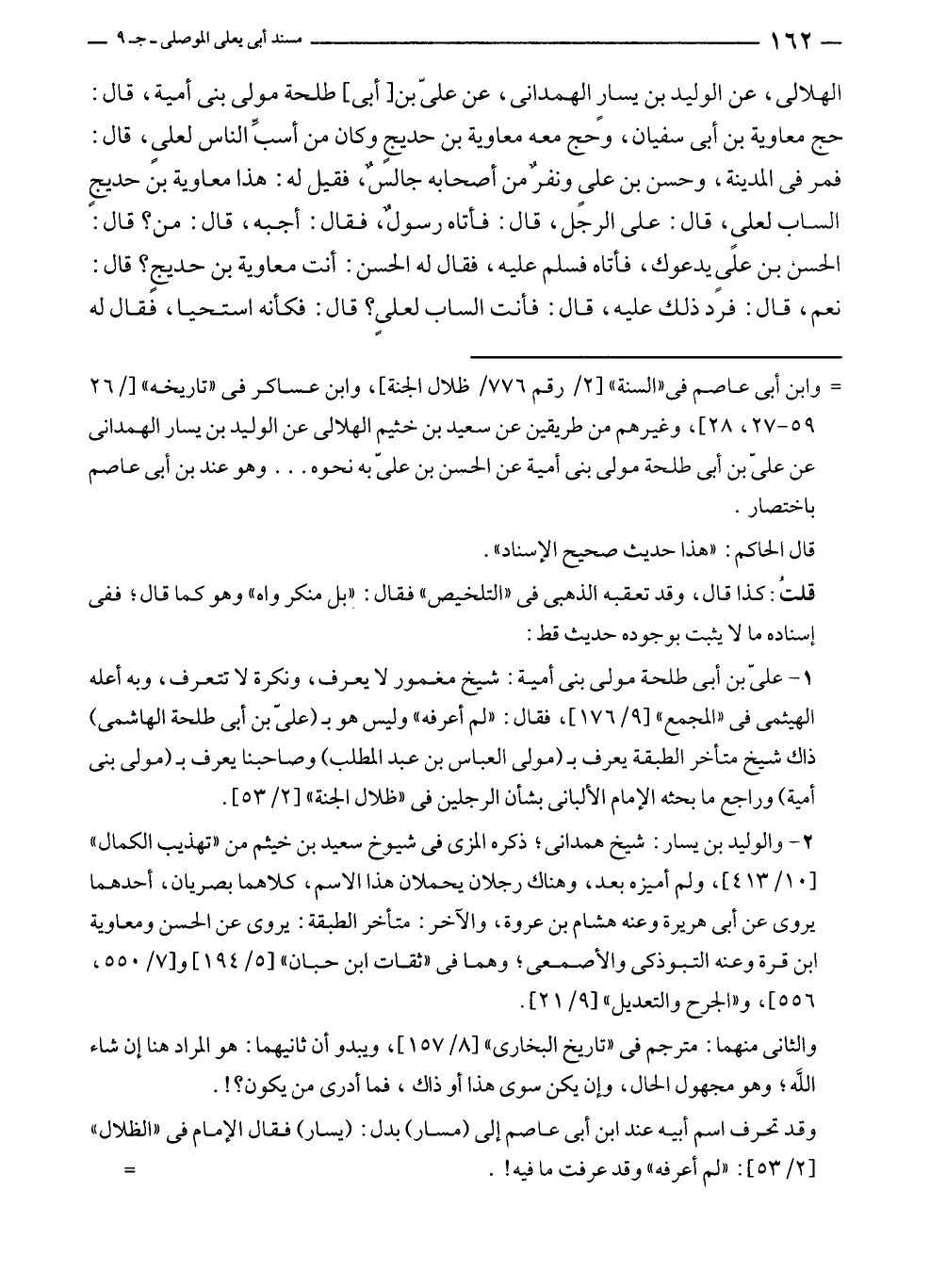 = وابن أبى عاصم في "السنة" [٢/ رقم ٧٧٦/ ظلال الجنة]، وابن عساكر في "تاريخه" [٥٩/ ٢٦ - ٢٧، ٢٨]، وغيرهم من طريقين عن سعيد بن خثيم الهلالى عن الوليد بن يسار الهمدانى عن عليّ بن أبى طلحة مولى بنى أمية عن الحسن بن عليّ به نحوه ... وهو عند بن أبى عاصم باختصار.