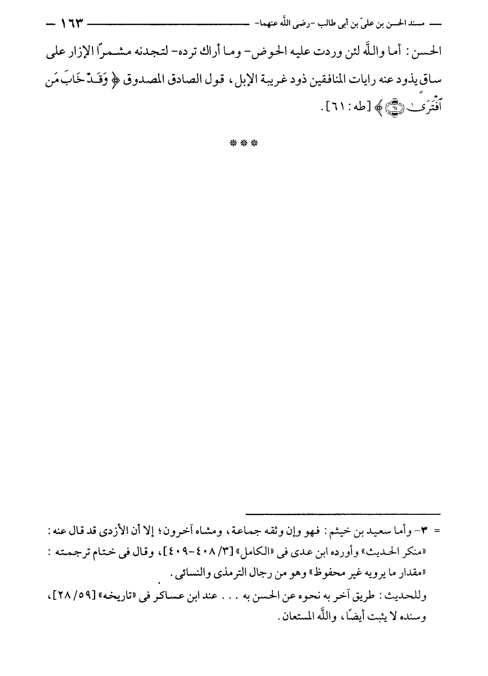 الحسن: أما واللَّه لئن وردت عليه الحوض - وما أراك ترده - لتجدنه مشمرًا الإزار على ساقٍ يذود عنه رايات المنافقين ذود غريبة الإبل، قول الصادق المصدوق {وَقَدْ خَابَ مَنِ افْتَرَى (٦١)} [طه: ٦١].