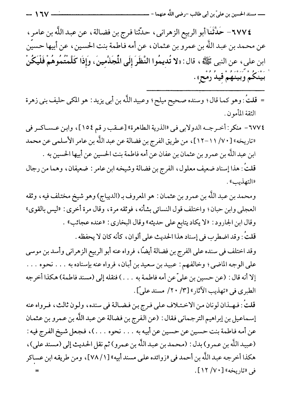 ٦٧٧٤ - حَذَّثَنَا أبو الربيع الزهرانى، حدّثنا فرج بن فضالة، عن عبد الله بن عامرٍ، عن محمد بن عبد الله بن عمرو بن عثمان، عن أمه فاطمة بنت الحسين، عن أبيها حسين بن علي، عن النبي - صلى الله عليه وسلم -، قال: "لا تُدِيمُوا النَّظَرَ إلَى المُجَذَّمِينَ، وَإذَا كَلَّمْتُمُوهُمْ فَلْيَكُنْ بَيْنَكُمْ وَبَيْنَهُمْ قِيدُ رُمْحٍ".