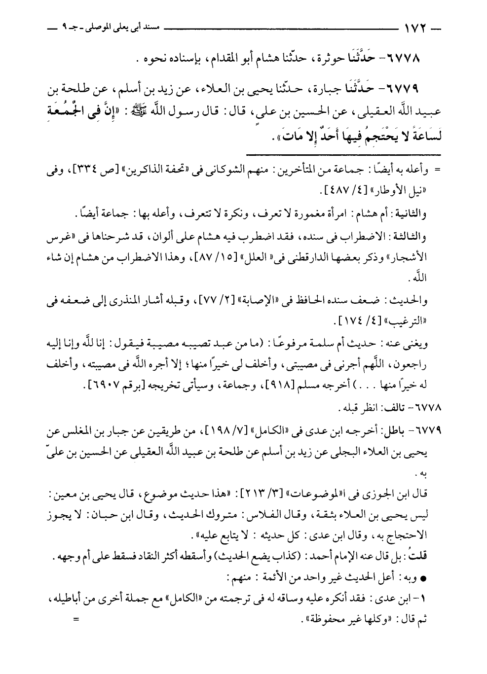 ٦٧٧٩ - حَدَّثَنَا جبارة، حدّثنا يحيى بن العلاء، عن زيد بن أسلم، عن طلحة بن عبيد الله العقيلى، عن الحسين بن علي، قال: قال رسول الله - صلى الله عليه وسلم -: "إن فِي الجُمعَةِ لسَاعَةً لا يحْتَجِمُ فِيهَا أَحَدٌ إِلا مَاتَ".