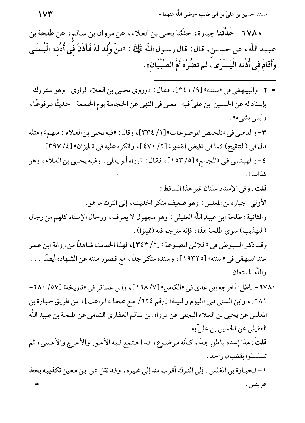 ٦٧٨٠ - حَدَّثَنَا جبارة، حدّثنا يحيى بن العلاء، عن مروان بن سالمٍ، عن طلحة بن عبيد الله، عن حسينٍ، قال: قال رسول الله - صلى الله عليه وسلم -: "مَنْ وُلِدَ لَهُ فَأَذَّنَ فِي أُذُنِهِ الْيُمْنَى وَأَقَامَ فِي أُذُنِهِ الْيُسْرَى، لَمْ تَضُرَّهُ أُمُّ الصِّبْيَانِ".