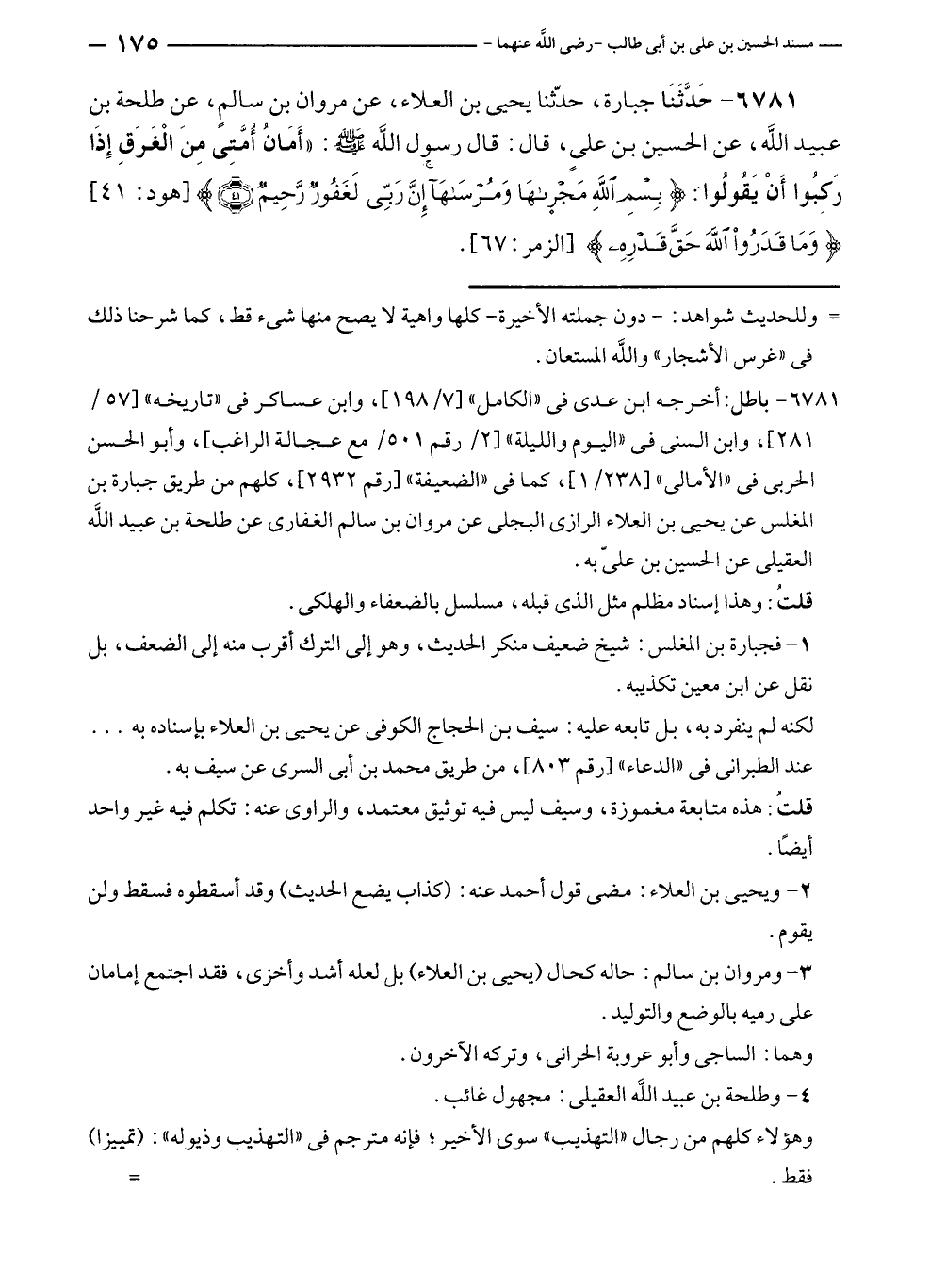 ٦٧٨١ - حَدَّثَنَا جبارة، حدّثنا يحيى بن العلاء، عن مروان بن سالمٍ، عن طلحة بن عبيد الله، عن الحسين بن علي، قال: قال رسول الله - صلى الله عليه وسلم -: "أَمَانُ أُمَّتِى مِنَ الْغَرَقِ إِذَا ركِبُوا أَنْ يَقُولُوا: {بِسْمِ اللَّهِ مَجْرَاهَا وَمُرْسَاهَا إِنَّ رَبِّي لَغَفُورٌ رَحِيمٌ (٤١)} [هود: ٤١] {وَمَا قَدَرُوا اللَّهَ حَقَّ قَدْرِهِ} [الزمر: ٦٧].