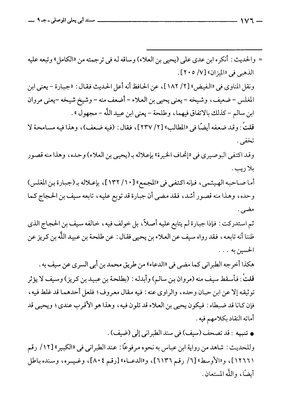 قلتُ: فأسقط سيف منه (مروان بن سالم) وأبدله: (بطلحة بن عبيد بن كريز) وسيف لا يؤثر توثيقه إلا عن ابن حبان وحده، والراوى عنه: فيه مقال معروف؛ فلعل أحدهما قد غلط فيه، فإن كانا قد ضبطاه: فيكون يحيى بن العلاء قد تلون فيه، وهذا هو الأقرب عندى؛ ويحيى قد أماته النقاد بكلامهم فيه.