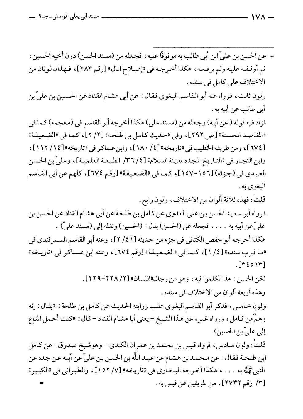 ولون ثالث، فرواه عنه أبو القاسم البغوى فقال: عن أبى هشام القناد عن الحسين بن عليّ بن أبى طالب عن أبيه به.