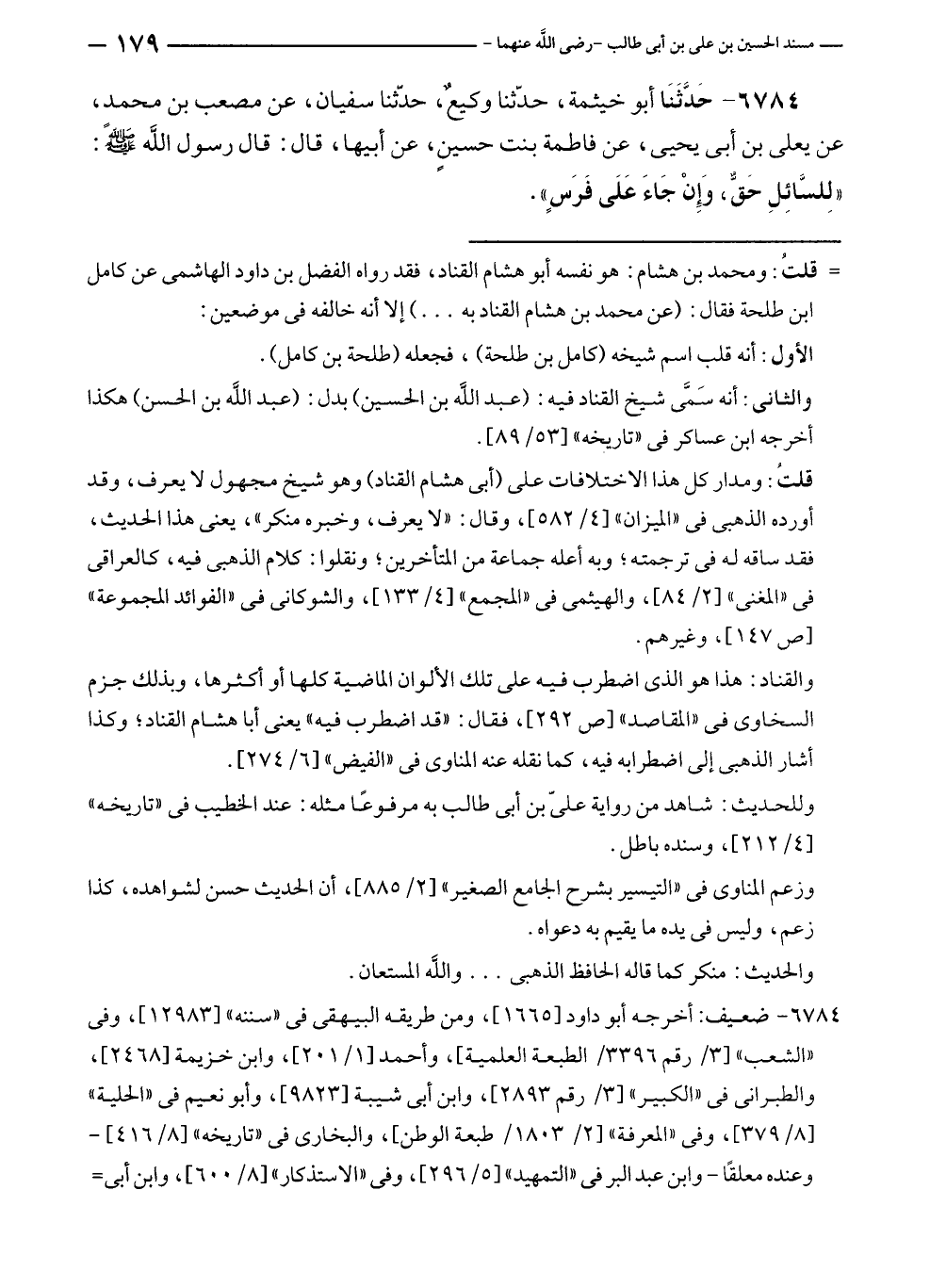 ٦٧٨٤ - حَدَّثَنَا أبو خيثمة، حدّثنا وكيعٌ، حدّثنا سفيان، عن مصعب بن محمد، عن يعلى بن أبى يحيى، عن فاطمة بنت حسينٍ، عن أبيها، قال: قال رسول الله - صلى الله عليه وسلم -: "لِلسَّائِلِ حَقٌّ، وَإن جَاءَ عَلَى فَرَسٍ".