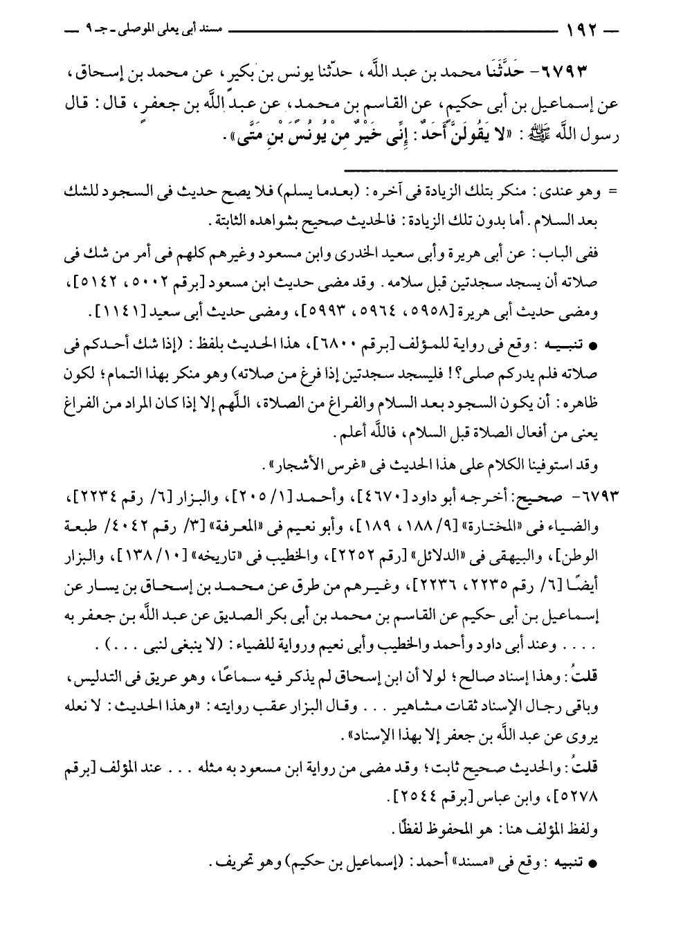 ٦٧٩٣ - حَدَّثَنَا محمد بن عبد الله، حدّثنا يونس بن بكيرٍ، عن محمد بن إسحاق، عن إسماعيل بن أبى حكيم، عن القاسِم بن محمد، عن عبد الله بن جعفرٍ، قال: قال رسول الله - صلى الله عليه وسلم -: "لا يَقُولَنَّ أَحَدٌ: إِنِّي خيْرٌ مِنْ يُونُسَ بْنِ مَتَّى".