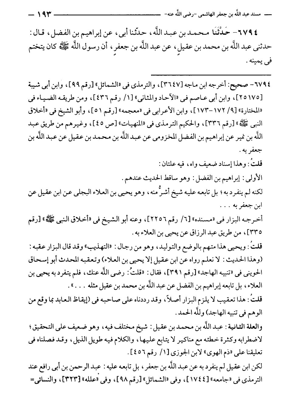 ٦٧٩٤ - حَدّثَنَا محمد بن عبد الله، حدّثنا أبى، عن إبراهيم بن الفضل، قال: حدثنى عبد الله بن محمد بن عقيلٍ، عن عبد الله بن جعفرٍ، أن رسول الله - صلى الله عليه وسلم - كان يتختم يمينه.