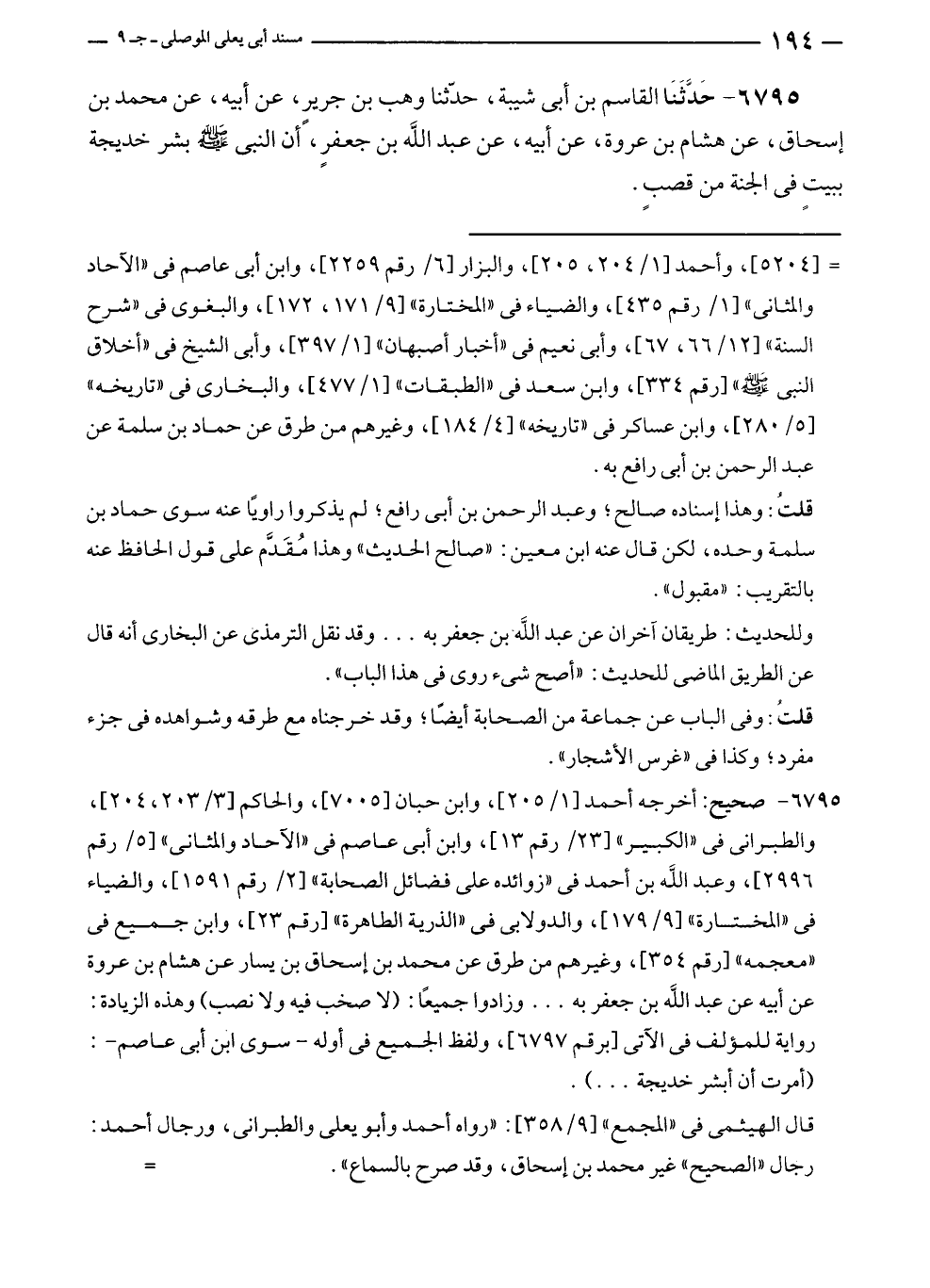 ٦٧٩٥ - حَدَّثَنَا القاسم بن أبى شيبة، حدّثنا وهب بن جريرٍ، عن أبيه، عن محمد بن إسحاق، عن هشام بن عروة، عن أبيه، عن عبد الله بن جعفرٍ، أن النبي - صلى الله عليه وسلم - بشر خديجة ببيتٍ في الجنة من قصبٍ.