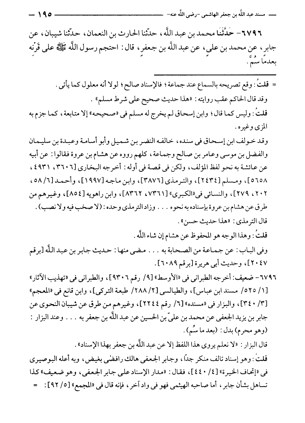 ٦٧٩٦ - حَدَّثَنا محمد بن عبد الله، حدّثنا الحارث بن النعمان، حدّثنا شيبان، عن جابرٍ، عن محمد بن علي، عن عبد الله بن جعفرٍ، قال: احتجم رسول الله - صلى الله عليه وسلم - على قَرِنْه بعدما سُمَّ.