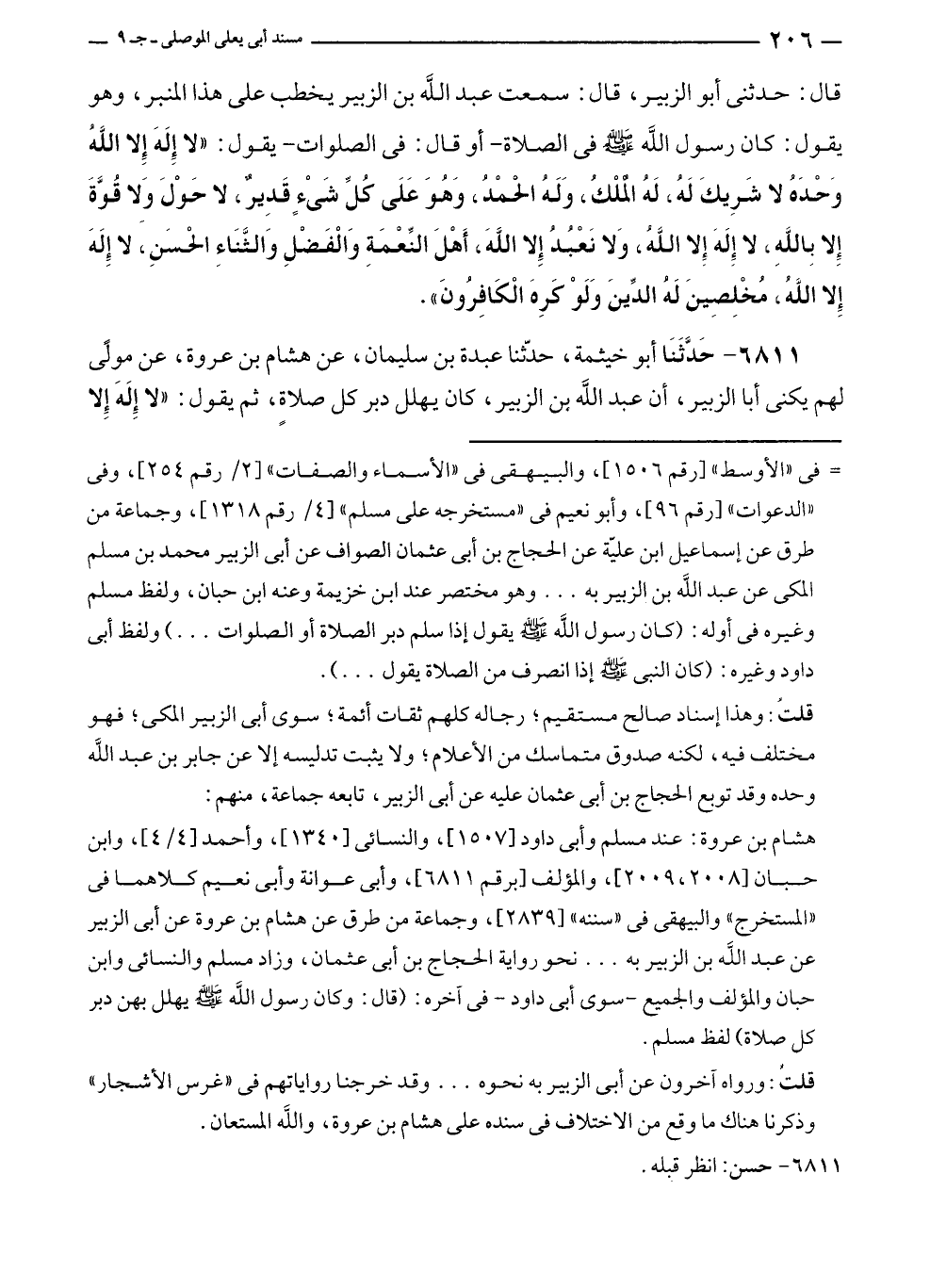 قال: حدثنى أبو الزبير، قال: سمعت عبد الله بن الزبير يخطب على هذا المنبر، وهو يقول: كان رسول الله - صلى الله عليه وسلم - في الصورة - أو قال: في الصلوات - يقول: "لا إِلَهَ إِلا اللهُ وَحْدَهُ لا شَرِيكَ لَهُ، لَهُ الْمُلْكُ، وَلَهُ الْحمْدُ، وَهُوَ عَلَى كُلِّ شَىْءٍ قَدِيرٌ، لا حَوْلَ ولا قُوَّةَ إِلا بِاللهِ، لا إِلَهَ إِلا اللهُ، وَلا نَعْبُدُ إِلا اللهَ، أَهْلَ النِّعْمَةِ وَالْفَضْلِ وَالثَّنَاءِ الحسَن، لا إِلَهَ إِلا اللهُ، مُخْلِصِينَ لَهُ الدِّينَ وَلَوْ كَرِهَ الْكَافِرُونَ".
