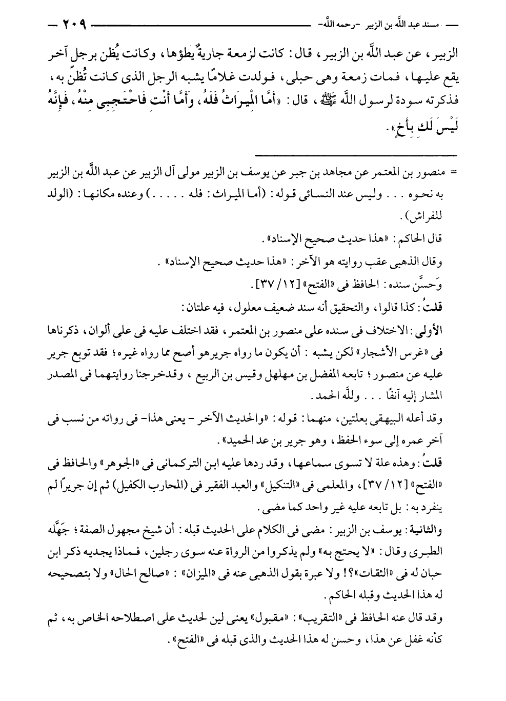 = منصور بن المعتمر عن مجاهد بن جبر عن يوسف بن الزبير مولى آل الزبير عن عبد الله بن الزبير به نحوه ... وليس عند النسائي قوله: (أما الميراث: فله ..... ) وعنده مكانها: (الولد للفراش).