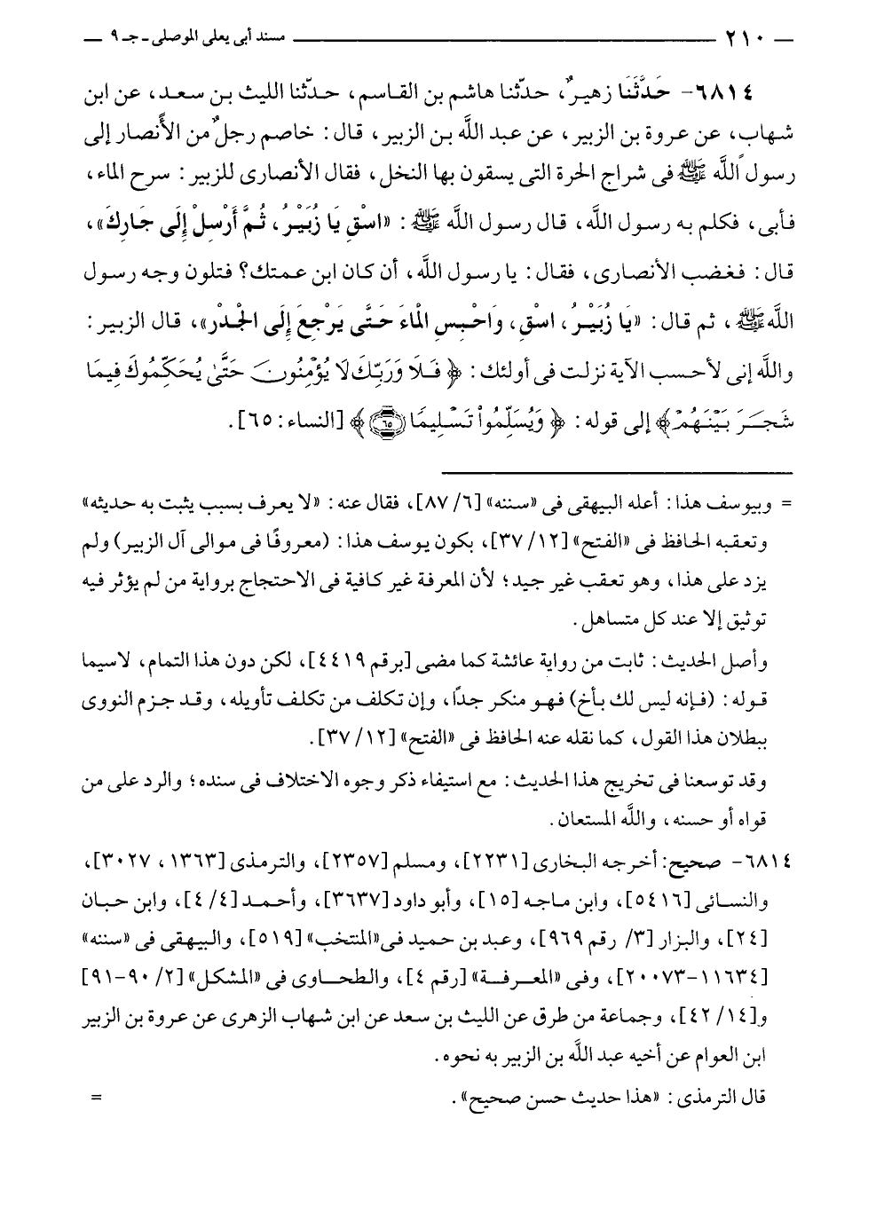 ٦٨١٤ - حَدَّثَنَا زهيرٌ، حدّثنا هاشم بن القاسم، حدّثنا الليث بن سعدٍ، عن ابن شهابٍ، عن عروة بن الزبير، عن عبد الله بن الزبير، قال: خاصم رجلٌ من الأنصار إلى رسول الله - صلى الله عليه وسلم - في شراج الحرة التى يسقون بها النخل، فقال الأنصارى للزبير: سرح الماء، فأبى، فكلم به رسول الله، قال رسول الله - صلى الله عليه وسلم -: "اسْقِ يَا زُبَيْرُ، ثُمَّ أَرْسِلْ إِلَى جَارِكَ"، قال: فغضب الأنصارى، فقال: يا رسول الله، أن كان ابن عمتك؟ فتلون وجه رسول الله - صلى الله عليه وسلم -، ثم قال: "يَا زُبَيْرُ، اسْقِ، وَاحْبِسِ الْماءَ حَتَّى يَرْجِعَ إِلَى الْجدْر"، قال الزبير: والله إنى لأحسب الآية نزلت في أولئك: {فَلَا وَرَبِّكَ لَا يُؤْمِنُونَ حَتَّى يُحَكِّمُوكَ فِيمَا شَجَرَ بَيْنَهُمْ} إلى قوله: {وَيُسَلِّمُوا تَسْلِيمًا (٦٥)} [النساء: ٦٥].