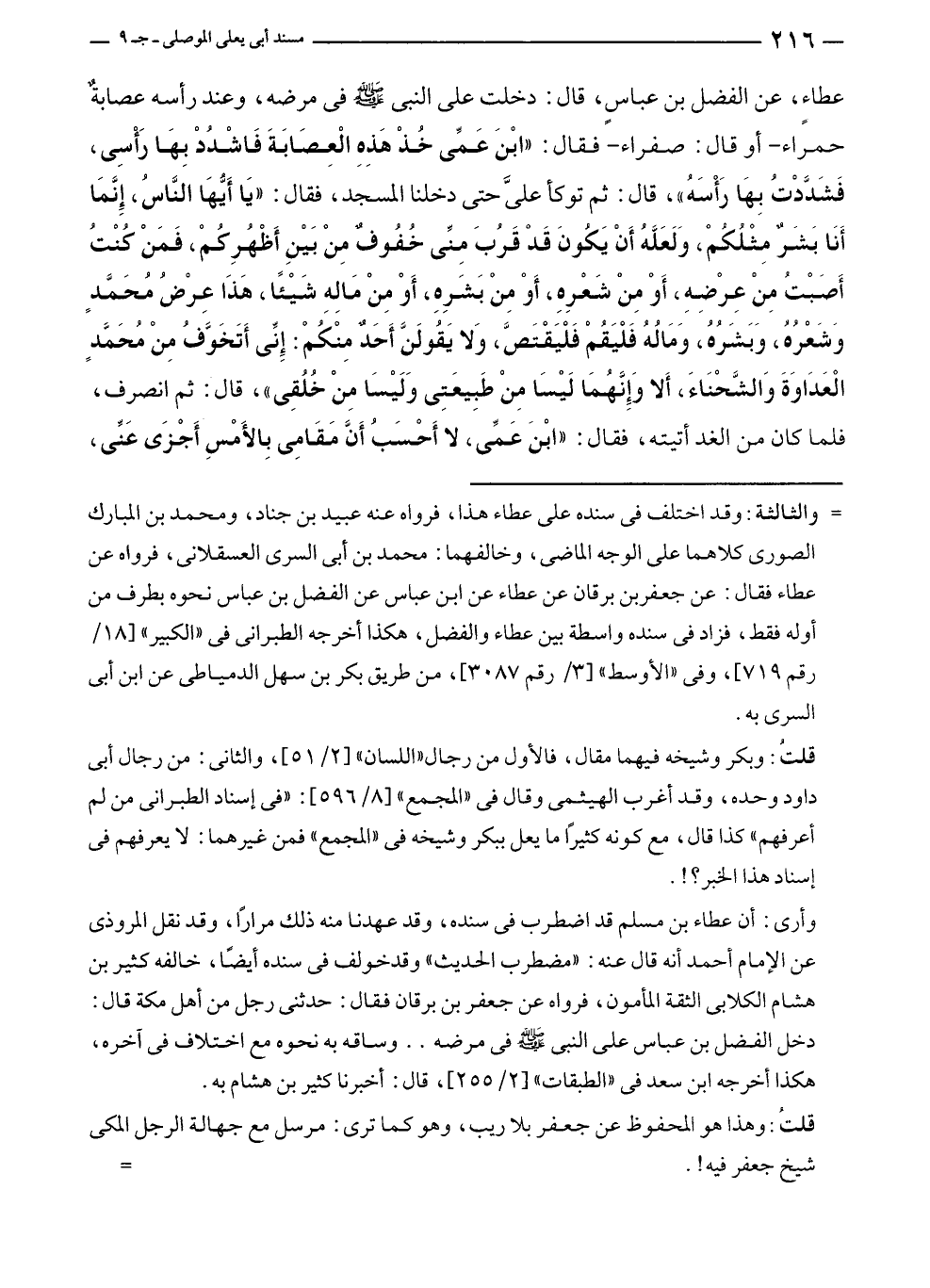 وأرى: أن عطاء بن مسلم قد اضطرب في سنده، وقد عهدنا منه ذلك مرارًا، وقد نقل المروذى عن الإمام أحمد أنه قال عنه: "مضطرب الحديث" وقدخولف في سنده أيضًا، خالفه كثير بن هشام الكلابى الثقة المأمون، فرواه عن جعفر بن برقان فقال: حدثنى رجل من أهل مكة قال: دخل الفضل بن عباس على النبي - صلى الله عليه وسلم - في مرضه .. وساقه به نحوه مع اختلاف في آخره، هكذا أخرجه ابن سعد في "الطبقات" [٢/ ٢٥٥]، قال: أخبرنا كثير بن هشام به.