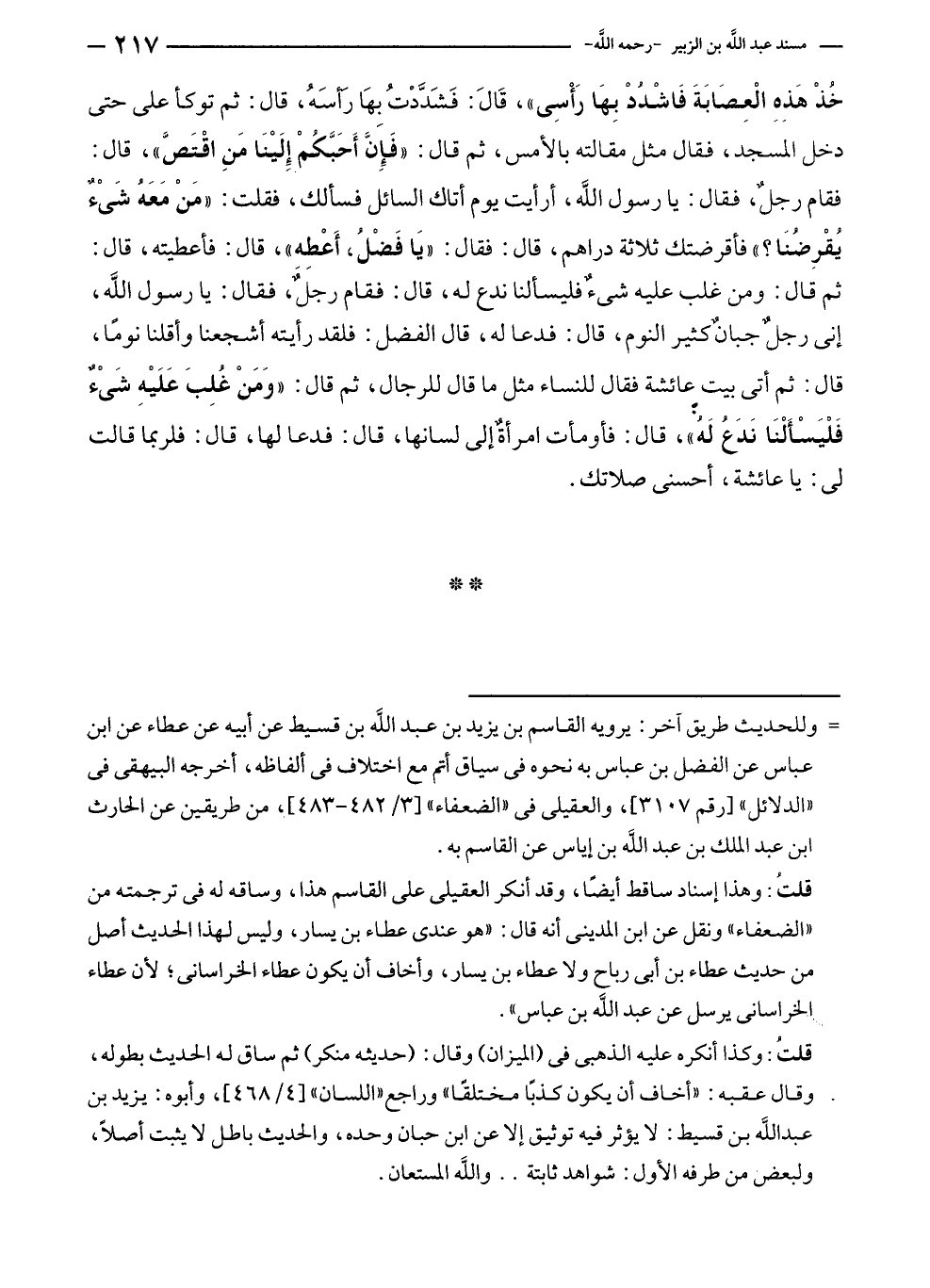 قلتُ: وهذا إسناد ساقط أيضًا، وقد أنكر العقيلى على القاسم هذا، وساقه له في ترجمته من "الضعفاء" ونقل عن ابن المدينى أنه قال: "هو عندى عطاء بن يسار، وليس لهذا الحديث أصل من حديث عطاء بن أبى رباح ولا عطاء بن يسار، وأخاف أن يكون عطاء الخراسانى؛ لأن عطاء الخراسانى يرسل عن عبد الله بن عباس".