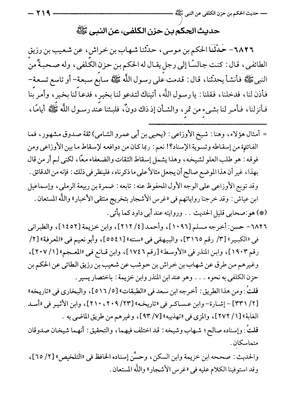 ٦٨٢٦ - حَدَّثَنَا الحكم بن موسى، حدّثنا شهاب بن خراشٍ، عن شعيب بن رزيقٍ الطائفى، قال: كنت جالسًا إلى رجلٍ يقال له الحكم بن حزنٍ الكلفى، وله صحبةٌ من النبي - صلى الله عليه وسلم - فأنشأ يحدّثنا، قال: قدمت على رسول الله - صلى الله عليه وسلم - سابع سبعة - أو تاسع تسعةٍ - فأذن لنا، فدخلنا، فقلنا: يا رسول الله، أتيناك لتدعو لنا بخيرٍ، فدعا لنا بخيرٍ، وأمر بنا فأنزلنا، فأمر لنا بشئٍ من تمرٍ، والشأن إذ ذاك دون، فلبثنا عند رسول الله - صلى الله عليه وسلم - أيامًا،