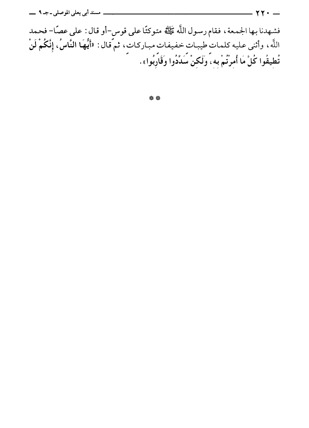فشهدنا بها الجمعة، فقام رسول الله - صلى الله عليه وسلم - متوكئًا على قوسٍ - أو قال: على عصًا - فحمد الله، وأثنى عليه كلمات طيباتٍ خفيفات مباركاتٍ، ثم قال: "أَيُّهَا النَّاسُ، إِنَّكُمْ لَنْ تُطِيقُوا كُلَّ مَا أُمِرْتُمْ بِهِ، وَلَكِنْ سَدِّدُوا وَقَارِبُوا".