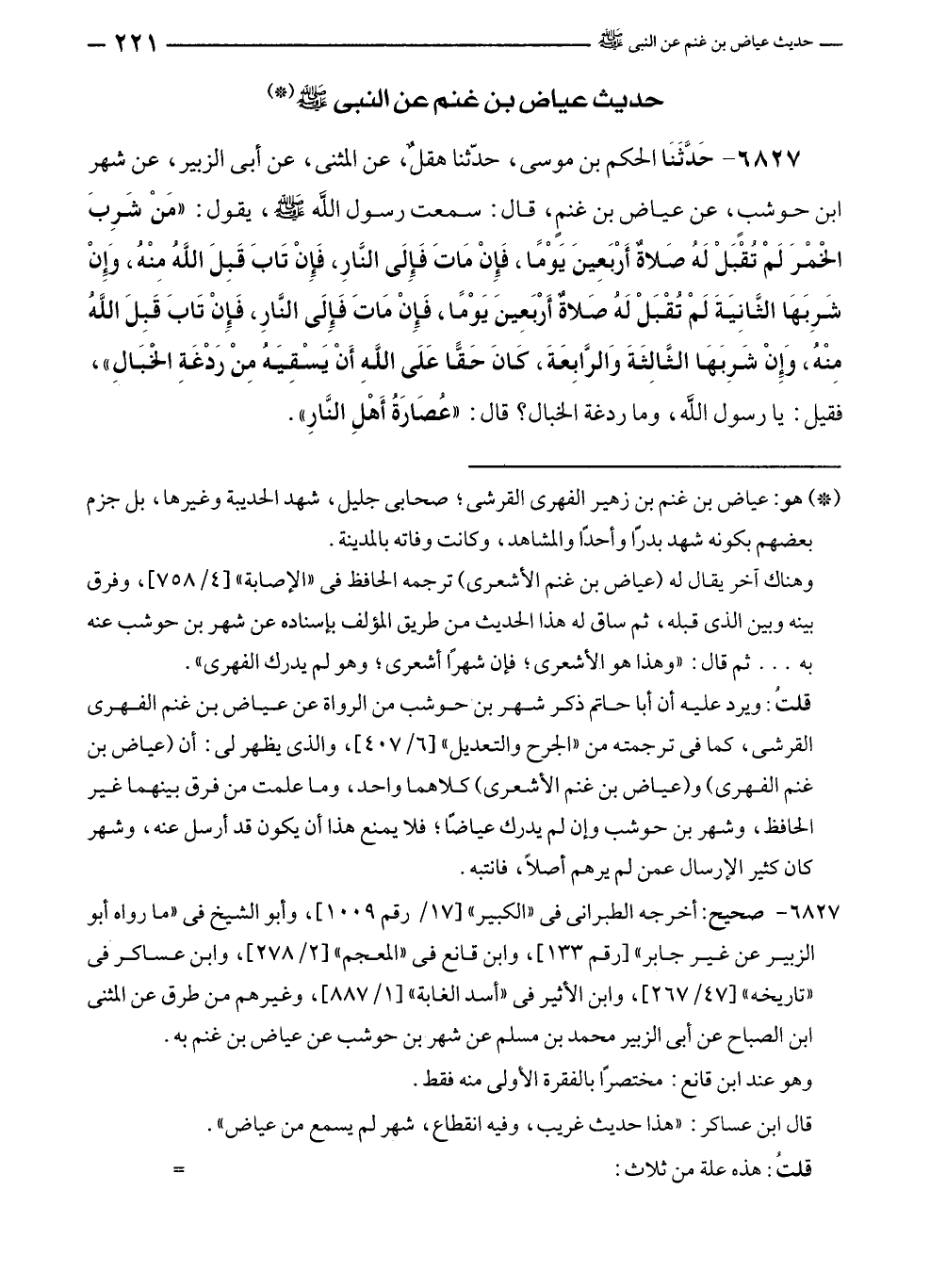 ٦٨٢٧ - حَدَّثَنَا الحكم بن موسى، حدّثنا هقلٌ، عن المثنى، عن أبى الزبير، عن شهر بن حوشبٍ، عن عياض بن غنمٍ، قال: سمعت رسول الله - صلى الله عليه وسلم -، يقول: "مَنْ شَرِبَ الْخمْرَ لَمْ تُقبَلْ لَهُ صَلاةٌ أَرْبَعِينَ يَوْمًا، فَإِنْ مَاتَ فَإِلَى النَّارِ، فَإِنْ تَابَ قَبِلَ اللهُ مِنْهُ، وَإِنْ شَرِبَهَا الثَّانِيَةَ لَمْ تُقْبَلْ لَهُ صَلاةٌ أَرْبَعِينَ يَوْمًا، فَإِنْ مَاتَ فَإِلَى النَّارِ، فَإِنْ تَابَ قَبِلَ اللهُ مِنْهُ، وَإِنْ شَرِبَهَا الثَّالِثَةَ وَالرَّابِعَةَ، كَانَ حَقًّا عَلَى اللهِ أَنْ يَسْقِيَهُ مِنْ رَدْغَةِ الْخبَالِ"، فقيل: يا رسول الله، وما ردغة الخبال؟ قال: "عُصَارَةُ أَهْلِ النَّارِ".