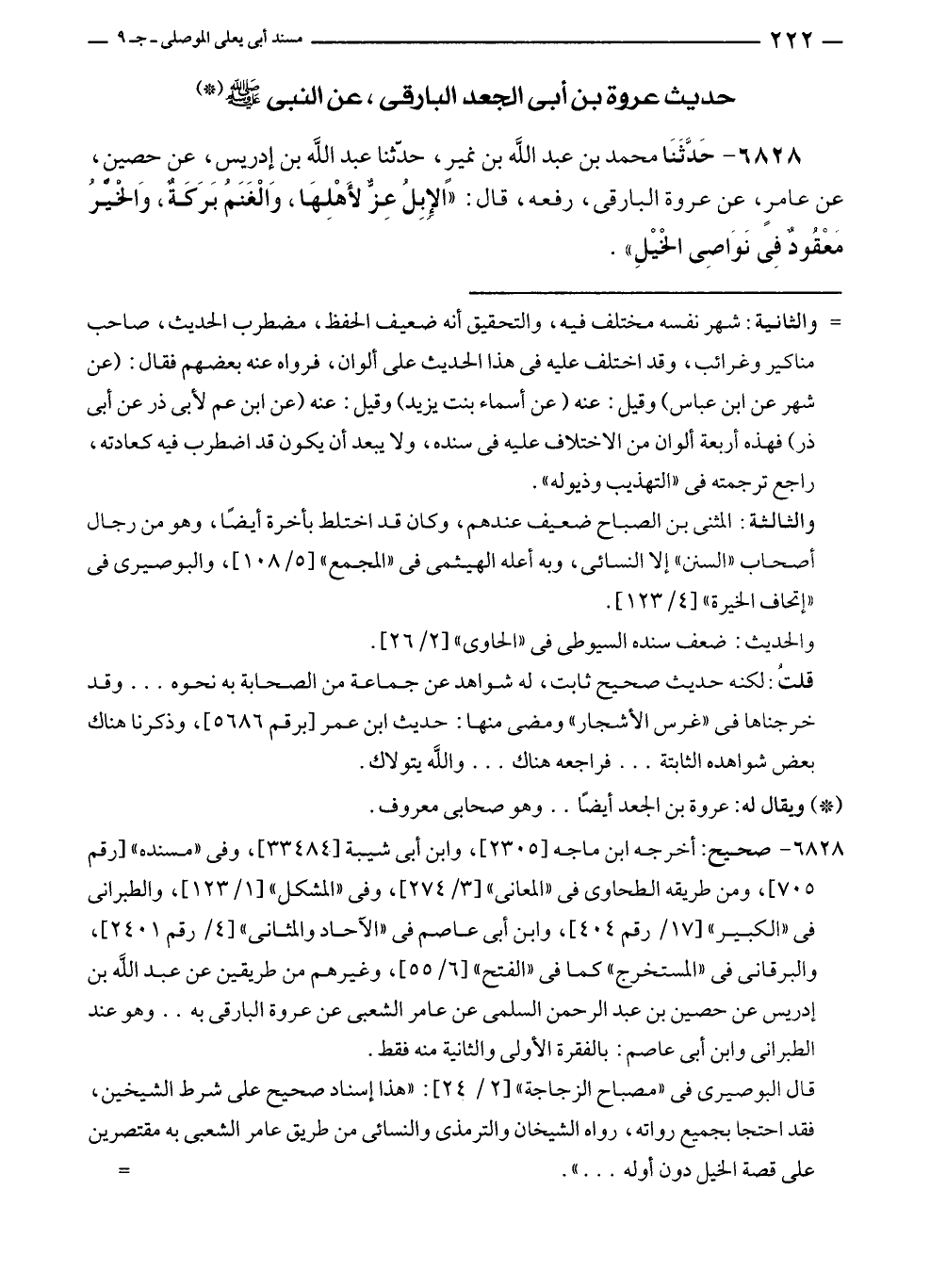 ٦٨٢٨ - حَدَّثَنَا محمد بن عبد الله بن نميرٍ، حدّثنا عبد الله بن إدريس، عن حصينٍ، عن عامرٍ، عن عروة البارقى، رفعه، قال: "الإِبِلُ عِزٌّ لأَهْلِهَا، وَالْغَنَمُ بَرَكَةٌ، وَالْخيْرُ مَعْقُودٌ فِي نَوَاصِى الْخيْلِ".