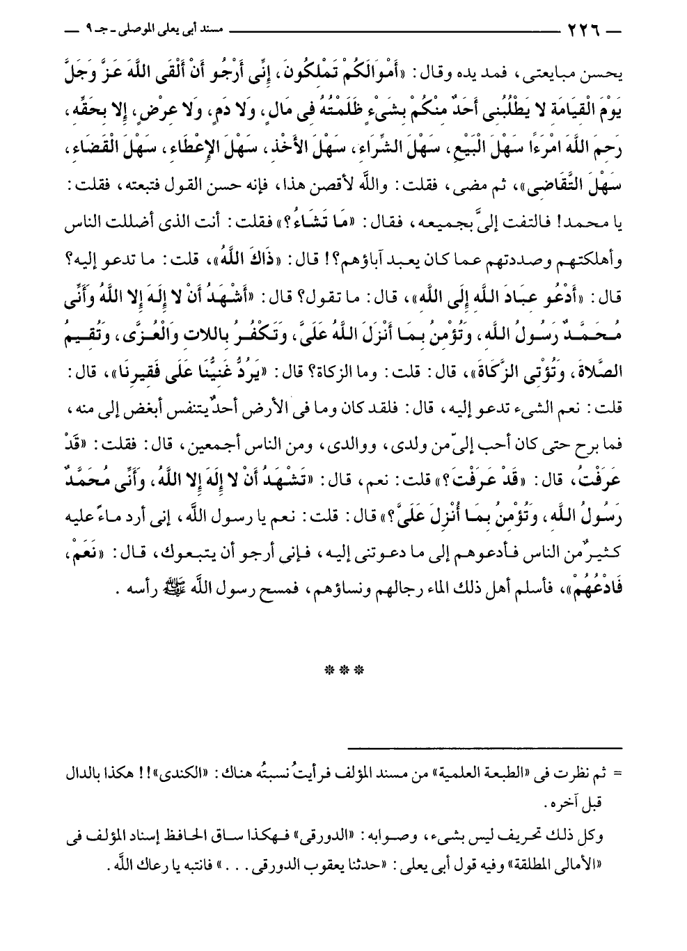يحسن مبايعتى، فمد يده وقال: "أَمْوَالَكُمْ تَمْلِكُونَ، إِنِّي أَرْجُو أَنْ أَلْقَى اللهَ عَزَّ وَجَلَّ يَوْمَ الْقِيَامَةِ لا يَطْلُبُنِى أَحَدٌ مِنْكُمْ بِشَىْءٍ ظَلَمْتُهُ فِي مَالٍ، وَلا دَمٍ، وَلا عِرْضٍ، إِلا بِحَقِّهِ، رَحِمَ اللهَ امْرَءًا سَهْلَ الْبَيْعِ، سَهْلَ الشِّرَاءِ، سَهْلَ الأَخْذِ، سَهْلَ الإِعْطَاءِ، سَهْلَ الْقَضَاءِ، سَهْلَ التَّقَاضِى"، ثم مضى، فقلت: والله لأقصن هذا، فإنه حسن القول فتبعته، فقلت: يا محمد! فالتفت إليَّ بجميعه، فقال: "مَا تَشَاءُ؟ " فقلت: أنت الذي أضللت الناس وأهلكتهم وصددتهم عما كان يعبد آباؤهم؟! قال: "ذَاكَ اللهُ"، قلت: ما تدعو إليه؟ قال: "أَدْعُو عِبَادَ اللهِ إِلَى اللهِ"، قال: ما تقول؟ قال: "أَشْهَدُ أَنْ لا إِلَهَ إِلا اللهُ وَأَنِّى مُحَمَّدٌ رَسُولُ اللهِ، وَتُؤْمِنُ بِمَا أَنْزَلَ اللهُ عَلَى، وَتَكْفُرُ بِاللاتِ وَالْعُزَى، وَتُقِيمُ الصَّلاةَ، وَتُؤْتِى الزَّكاةَ"، قال: قلت: وما الزكاة؟ قال: "يَرُدُّ غَنِيُّنَا عَلَى فَقِيرِنَا"، قال: قلت: نعم الشئ تدعو إليه، قال: فلقد كان وما في الأرض أحدٌ يتنفس أبغض إلى منه، فما برح حتى كان أحب إليّ من ولدى، ووالدى، ومن الناس أجمعين، قال: فقلت: "قَدْ عَرَفْتُ، قال: "قَدْ عَرَفْتَ؟ " قلت: نعم، قال: "تَشْهَدُ أَنْ لا إِلَهَ إِلا اللهُ، وَأَنِّى مُحَمَّدٌ رَسُولُ اللهِ، وَتُؤْمِنُ بِمَا أُنْزِلَ عَلَيَّ؟ " قال: قلت: نعم يا رسول الله، إنى أرد ماءً عليه كثيرٌ من الناس فأدعوهم إلى ما دعوتنى إليه، فإنى أرجو أن يتبعوك، قال: "نَعَمْ، فَادْعُهُمْ"، فأسلم أهل ذلك الماء رجالهم ونساؤهم، فمسح رسول الله - صلى الله عليه وسلم - رأسه.