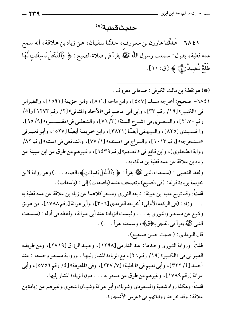 قلتُ: وقد توبع عليه ابن عيينة: تابعه الثورى ومسعر كلاهما عن زياد بن علاقة عن عمه قطبة به ... وزاد: (في الركعة الأولى) أخرجه الترمذى [٣٠٦]، وأبو عوانة [رقم ١٧٨٨]، من طريق وكيع عن مسعر والثورى به ... وليست الزيادة عند أبى عوانة، ولفظه في أوله: (سمعت النبي - صلى الله عليه وسلم - يقرأ في الفجر بـ {ق}، وسمعته يقرأ ... ).