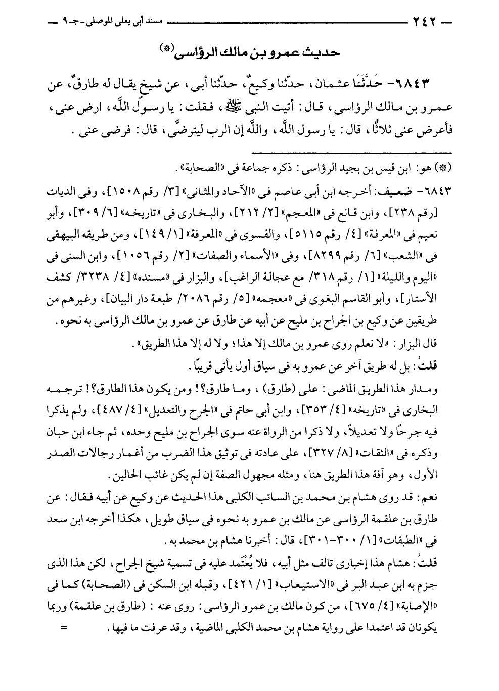 ٦٨٤٣ - حَدَّثَنَا عثمان، حدّثنا وكيعٌ، حدّثنا أبي، عن شيخٍ يقال له طارقٌ، عن عمرو بن مالك الرؤاسي، قال: أتيت النبي - صلى الله عليه وسلم -، فقلت: يا رسول الله، ارض عنى، فأعرض عنى ثلاثًا، قال: يا رسول الله، واللَّه إن الرب ليترضَّى، قال: فرضي عني.