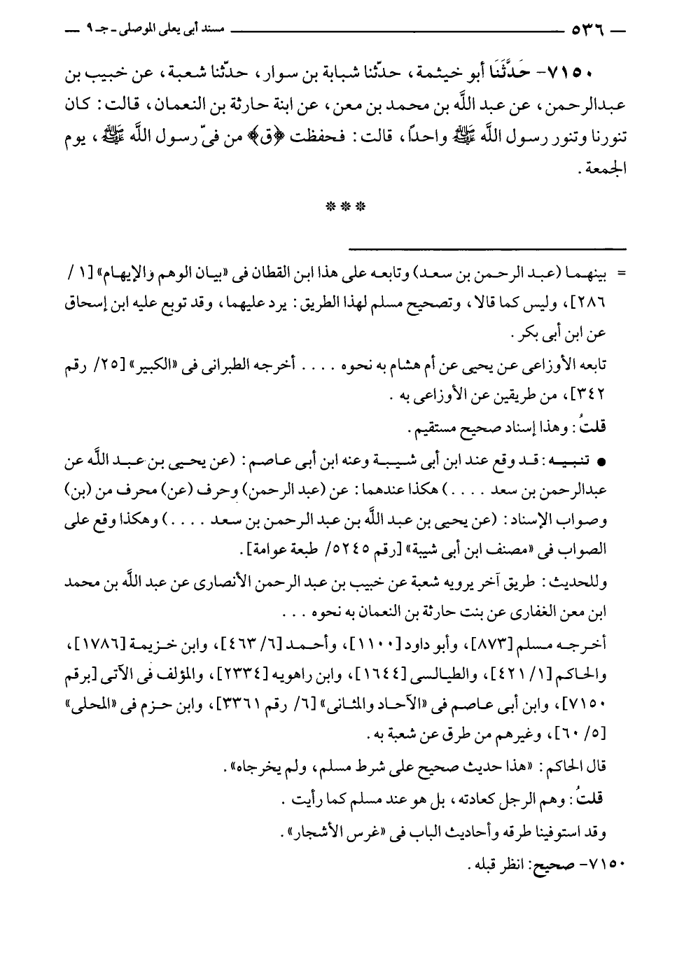 ٧١٥٠ - حَدَّثَنَا أبو خيثمة، حدّثنا شبابة بن سوار، حدّثنا شعبة، عن خبيب بن عبد الرحمن، عن عبد الله بن محمد بن معن، عن ابنة حارثة بن النعمان، قالت: كان تنورنا وتنور رسول الله - صلى الله عليه وسلم - واحدًا، قالت: فحفظت {ق} من فيّ رسول الله - صلى الله عليه وسلم -، يوم الجمعة.