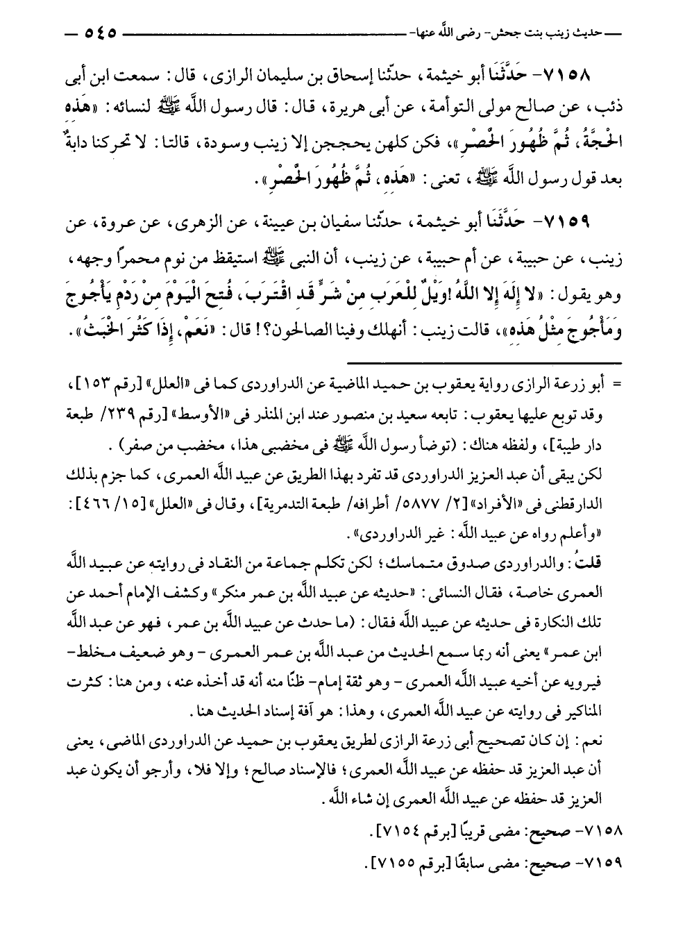 نعم: إن كان تصحيح. أبى زرعة الرازى لطريق يعقوب بن حميد عن الدراوردى الماضى، يعنى أن عبد العزيز قد حفظه عن عبيد الله العمرى؛ فالإسناد صالح؛ وإلا فلا، وأرجو أن يكون عبد العزيز قد حفظه عن عبيد الله العمرى إن شاء الله.