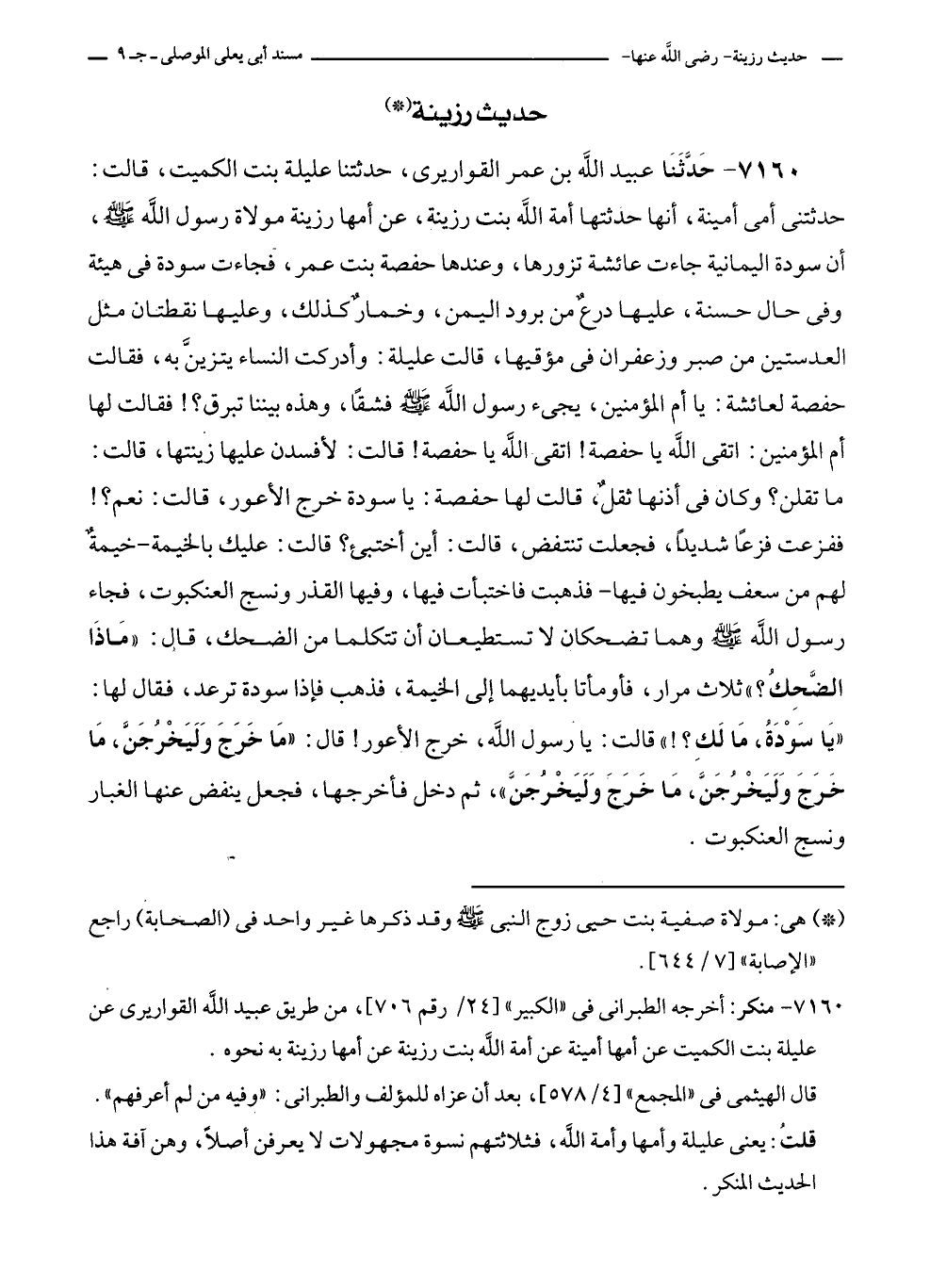 ٧١٦٠ - حَدَّثَنَا عبيد الله بن عمر القواريرى، حدثتنا عليلة بنت الكميت، قالت: حدثتنى أمى أمينة، أنها حدثتها أمة الله بنت رزينة، عن أمها رزينة مولاة رسول الله - صلى الله عليه وسلم -، أن سودة اليمانية جاءت عائشة تزورها، وعندها حفصة بنت عمر، فجاءت سودة في هيئة وفى حال حسنة، عليها درعٌ من برود اليمن، وخمارٌ كذلك، وعليها نقطتان مثل العدستين من صبر وزعفران في مؤقيها، قالت عليلة: وأدركت النساء يتزينَّ به، فقالت حفصة لعائشة: يا أم المؤمنين، يجئ رسول الله - صلى الله عليه وسلم - فشقًا، وهذه بيننا تبرق؟! فقالت لها أم المؤمنين: اتقى الله يا حفصة! اتقى الله يا حفصة! قالت: لأفسدن عليها زينتها، قالت: ما تقلن؟ وكان في أذنها ثقلٌ، قالت لها حفصة: يا سودة خرج الأعور، قالت: نعم؟! ففزعت فزعًا شديدًا، فجعلت تنتفض، قالت: أين أختبئ؟ قالت: عليك بالخيمة - خيمةٌ لهم من سعف يطبخون فيها - فذهبت فاختبأت فيها، وفيها القذر ونسج العنكبوت، فجاء رسول الله - صلى الله عليه وسلم - وهما تضحكان لا تستطيعان أن تتكلما من الضحك، قال: "مَاذَا الضَّحِكُ؟ " ثلاث مرار، فأومأتا بأيديهما إلى الخيمة، فذهب فإذا سودة ترعد، فقال لها: "يَا سَوْدَة، مَا لَكِ؟! " قالت: يا رسول الله، خرج الأعور! قال: "مَا خَرَجَ وَلَيَخْرُجَنَّ، مَا خَرَجَ وَلَيَخْرُجَنَّ، مَا خَرَجَ وَلَيَخْرُجَنَّ"، ثم دخل فأخرجها، فجعل ينفض عنها الغبار ونسج العنكبوت.