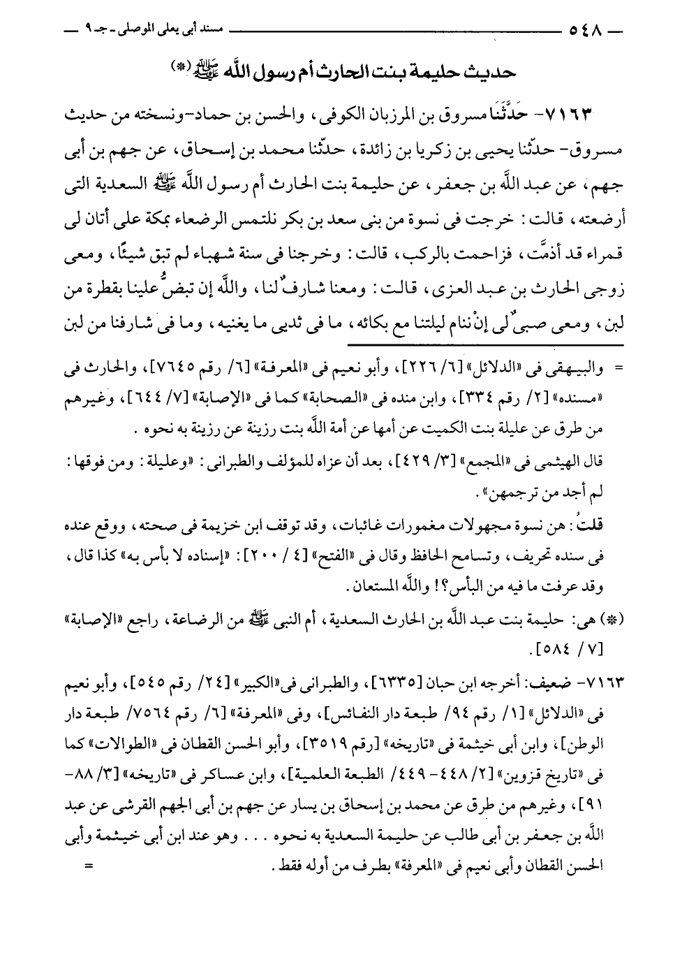 ٧١٦٣ - حَدَّثَنَا مسروق بن المرزبان الكوفى، والحسن بن حماد - ونسخته من حديث مسروق - حدّثنا يحيى بن زكريا بن زائدة، حدّثنا محمد بن إسحاق، عن جهم بن أبى جهم، عن عبد الله بن جعفر، عن حليمة بنت الحارث أم رسول الله - صلى الله عليه وسلم - السعدية التى أرضعته، قالت: خرجت في نسوة من بنى سعد بن بكر نلتمس الرضعاء بمكة على أتان لى قمراء قد أذمَّت، فزاحمت بالركب، قالت: وخرجنا في سنة شهباء لم تبق شيئًا، ومعى زوجى الحارث بن عبد العزى، قالت: ومعنا شارفٌ لنا، والله إن تبضُّ علينا بقطرة من لبن، ومعى صبىٌ لى إنْ ننام ليلتنا مع بكائه، ما في ثديى ما يغنيه، وما في شارفنا من لبن