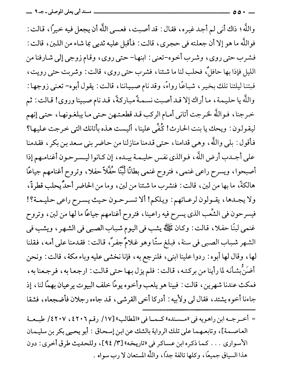 واللَّه؛ ذاك أنى لم أجد غيره، فقال: قد أصبت، فعسى الله أن يجعل فيه خيرًا، قالت: فوالله ما هو إلا أن جعلته في حجرى، قالت: فأقبل عليه ثديى بما شاء من اللبن، قالت: فشرب حتى روى، وشرب أخوه - تعنى: ابنها - حتى روى، وقام زوجى إلى شارفنا من الليل فإذا بها حافلٌ، فحلب لنا ما شئنا، فشرب حتى روى، قالت: وشربت حتى رويت، فبتنا ليلتنا تلك بخير، شباعًا رواءً، وقد نام صبياننا، قالت: يقول أبوه - تعنى زوجها: والله يا حليمة، ما أراك إلا قد أصبت نسمةً مباركةً، قد نام صبينا وروى! قالت: ثم خرجنا، فوالله لخرجت أتانى أمام الركب قد قطعتهن حتى ما يبلغونها، حتى إنهم ليقولون: ويحك يا بنت الحارث! كُفِّى علينا، أليست هذه بأتانك التى خرجت عليها؟ فأقول: بلى والله، وهى قدامنا، حتى قدمنا منازلنا من حاضر بنى سعد بن بكر، فقدمنا على أجدب أرض الله، فوالذى نفس حليمة بيده، إن كانوا ليسرحون أغنامهم إذا أصبحوا، ويسرح راعى غنمى، فتروح غنمى بطانًا لُبَّنًا حُفَّلًا حفلا، وتروح أغنامهم جياعًا هالكةً، ما بها من لبن، قالت: فنشرب ما شئنا من لبن، وما من الحاضر أحدٌ يحلب قطرةً، ولا يجدها، يقولون لرعاتهم: ويلكم! ألا تسرحون حيث يسرح راعى حليمة؟! فيسرحون في الشِّعب الذي يسرح فيه راعينا، فتروح أغنامهنم جياعًا ما لها من لبن، وتروح غنمى لبنًا حفلا، قالت: وكان - صلى الله عليه وسلم - يشب في اليوم شباب الصبى في الشهر، ويشب في الشهر شباب الصبى في سنة، فبلغ ستًا وهو غلامٌ جفرٌ، قالت: فقدمنا على أمه، فقلنا لها، وقال لها أبوه: ردوا علينا ابنى، فلنرجع به، فإنا نخشى عليه وباء مكة، قالت: ونحن أضَنُّ بشأنه لما رأينا من بركته، قالت: فلم يزل بها حتى قالت: ارجعا به، فرجعنا به، فمكث عندنا شهرين، قالت: فبينا هو يلعب وأخوه يومًا خلف البيوت يرعيان بهمًا لنا، إذ جاءنا أخوه يشتد، فقال لى ولأبيه: أدركا أخى القرشى، قد جاءه رجلان فأضجعاه، فشقا