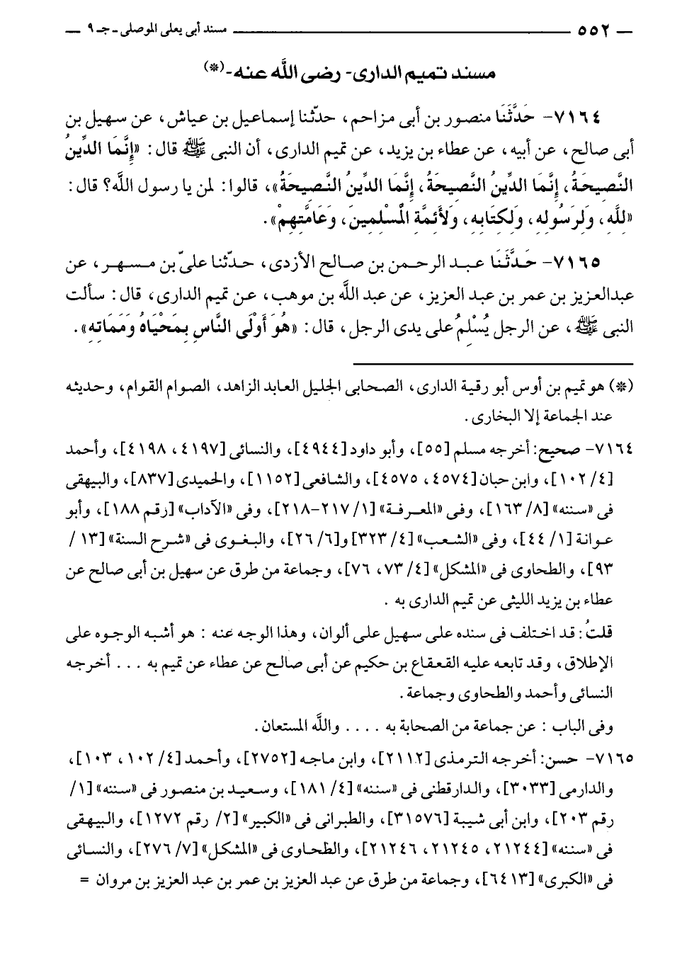 ٧١٦٤ - حَدَّثَنَا منصور بن أبى مزاحم، حدّثنا إسماعيل بن عياش، عن سهيل بن أبى صالح، عن أبيه، عن عطاء بن يزيد، عن تميم الدارى، أن النبي - صلى الله عليه وسلم - قال: "إِنَّمَا الدِّينُ النَّصيحية، إنَّمَا الدِّينُ النَّصِيحَة، إِنَّمَا الدِّينُ النَّصيحَةُ"، قالوا: لمن يا رسول الله؟ قال: "لله، وَلِرَسُولِهِ، وَلِكِتَابِهِ، وَلأَئِمَّةِ الْمُسْلِمِينَ، وَعَامَّتِهِمْ".