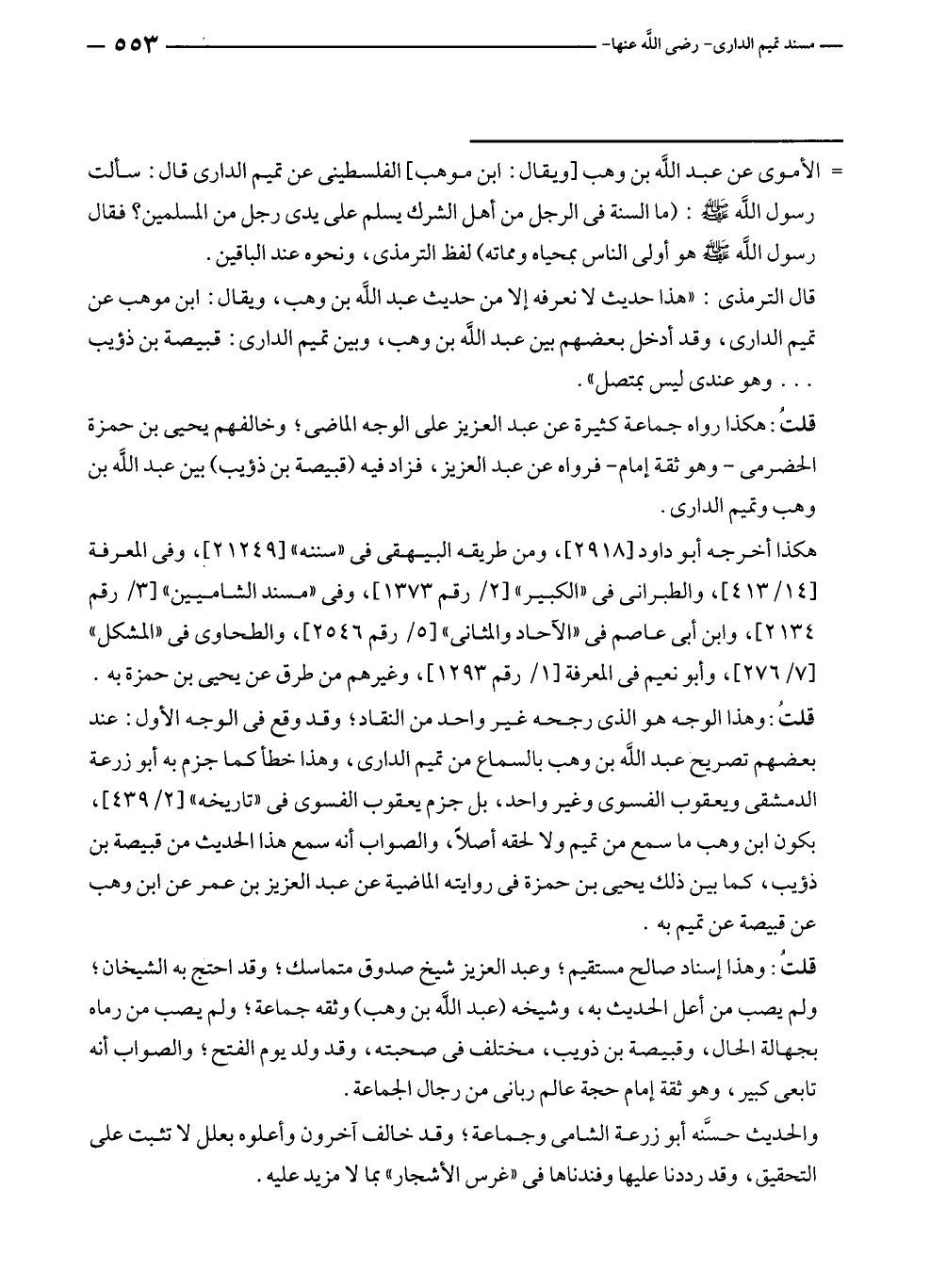 قلتُ: وهذا الوجه هو الذي رجحه غير واحد من النقاد؛ وقد وقع في الوجه الأول: عند بعضهم تصريح عبد الله بن وهب بالسماع من تميم الدارى، وهذا خطأ كما جزم به أبو زرعة الدمشقى ويعقوب الفسوى وغير واحد، بل جزم يعقوب الفسوى في "تاريخه" [٢/ ٤٣٩]، بكون ابن وهب ما سمع من تميم ولا لحقه أصلًا، والصواب أنه سمع هذا الحديث من قبيصة بن ذؤيب، كما بين ذلك يحيى بن حمزة في روايته الماضية عن عبد العزيز بن عمر عن ابن وهب عن قبيصة عن تميم به.