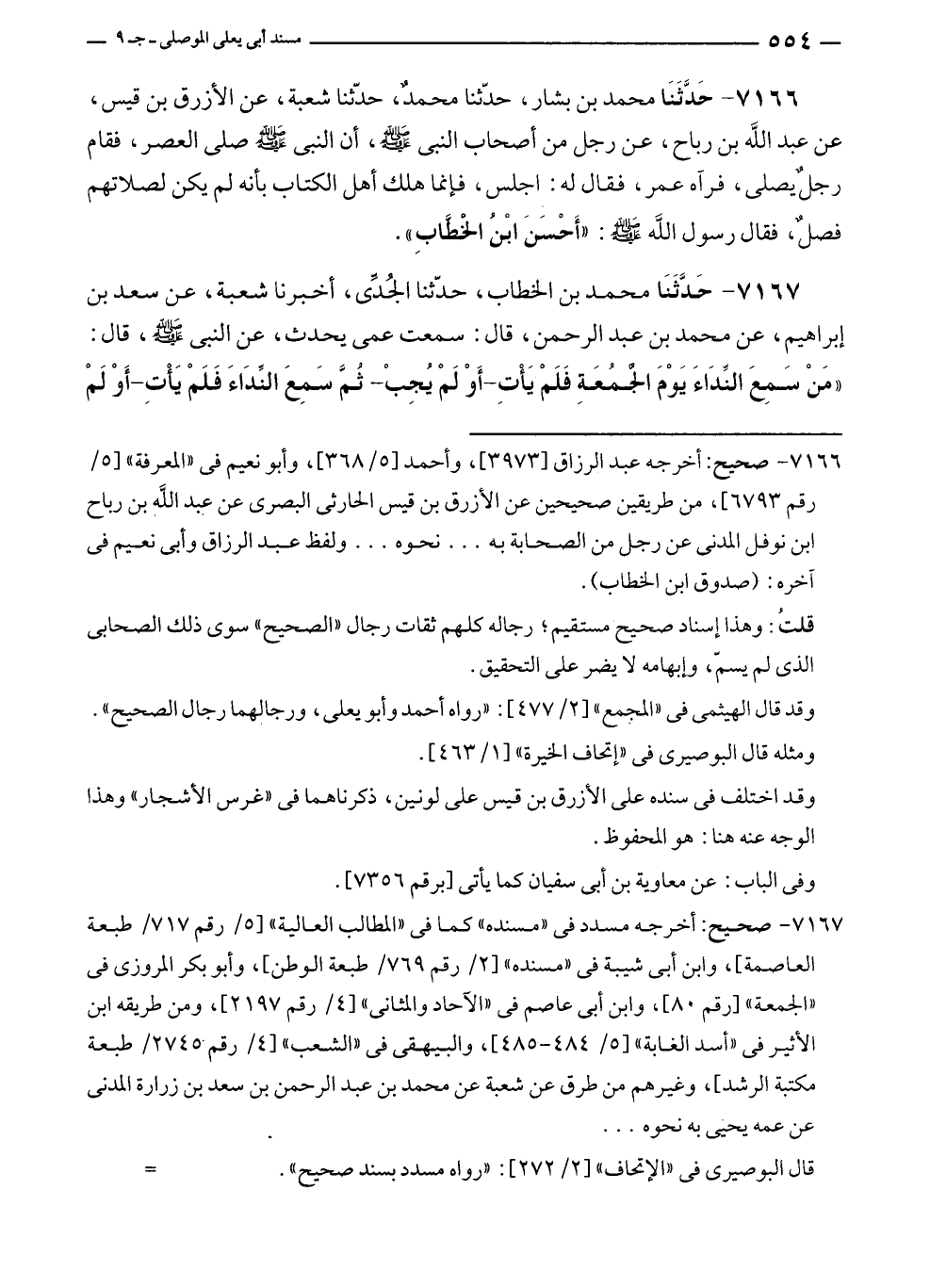 ٧١٦٧ - صحيح: أخرجه مسدد في "مسنده" كما في "المطالب العالية" [٥/ رقم ٧١٧/ طبعة العاصمة]، وابن أبى شيبة في "مسنده" [٢/ رقم ٧٦٩/ طبعة الوطن]، وأبو بكر المروزى في "الجمعة" [رقم ٨٠]، وابن أبى عاصم في "الآحاد والمثانى" [٤/ رقم ٢١٩٧]، ومن طريقه ابن الأثير في "أسد الغابة" [٥/ ٤٨٤ - ٤٨٥]، والبيهقى في "الشعب" [٤/ رقم ٢٧٤٥/ طبعة مكتبة الرشد]، وغيرهم من طرق عن شعبة عن محمد بن عبد الرحمن بن سعد بن زرارة المدنى عن عمه يحيى به نحوه ...