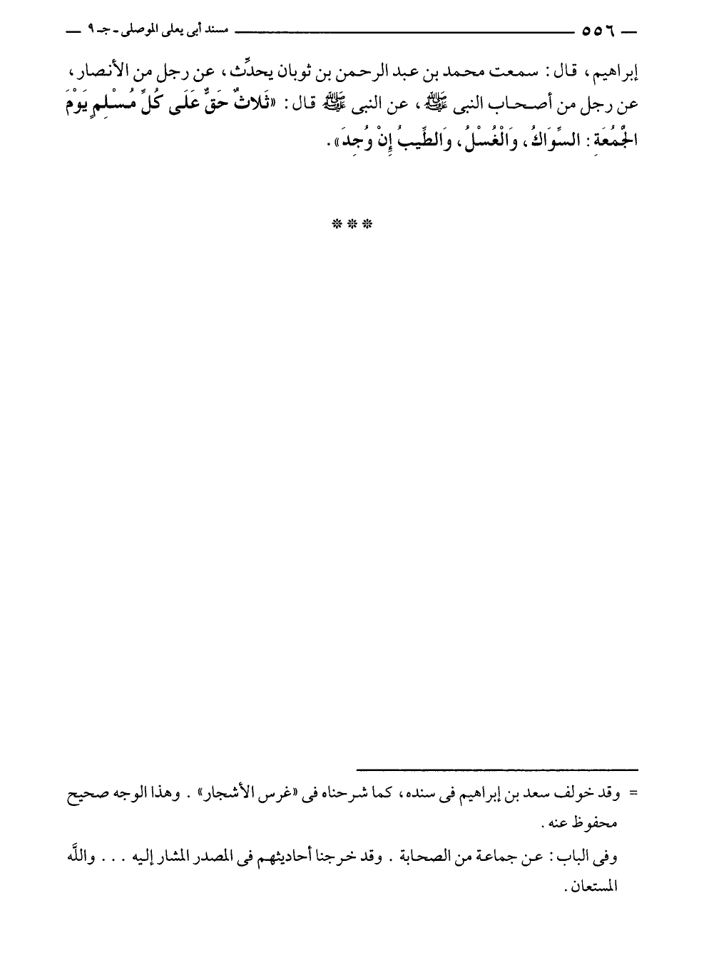 إبراهيم، قال: سمعت محمد بن عبد الرحمن بن ثوبان يحدِّث، عن رجل من الأنصار، عن رجل من أصحاب النبي - صلى الله عليه وسلم -، عن النبي - صلى الله عليه وسلم - قال: "ثَلاثٌ حَقٌّ عَلَى كلِّ مُسْلِمٍ يَوْمَ الجمُعَةِ: السِّوَاك، وَالْغُسْل، وَالطِّيبُ إِن وُجِدَ".