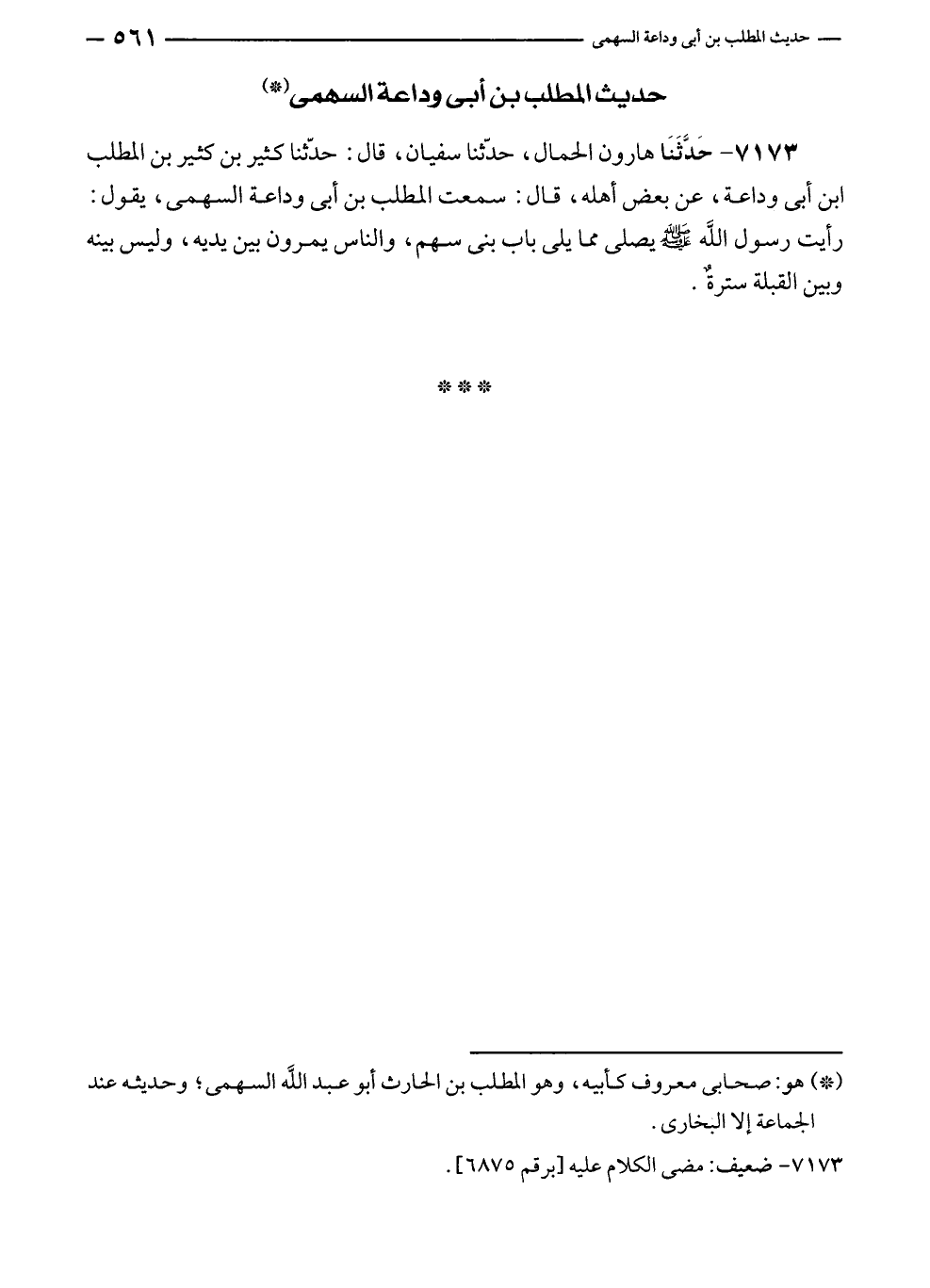 ٧١٧٣ - حَدَّثَنَا هارون الحمال، حدّثنا سفيان، قال: حدّثنا كثير بن كثير بن المطلب بن أبى وداعة، عن بعض أهله، قال: سمعت المطلب بن أبى وداعة السهمى، يقول: رأيت رسول الله - صلى الله عليه وسلم - يصلى مما يلى باب بنى سهم، والناس يمرون بين يديه، وليس بينه وبين القبلة سترةٌ.