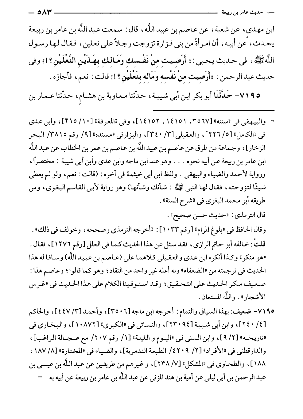 ابن مهدىٍ، عن شعبة، عن عاصم بن عبيد الله، قال: سمعت عبد الله بن عامر بن ربيعة يحدث، عن أبيه، أن امرأةً من بنى فزارة تزوجت رجلًا على نعلين، فقال لها رسول الله - صلى الله عليه وسلم -، في حديث يحيى: "أَرَضِيتِ مِنْ نَفْسِكِ وَمَالِكِ بِهَذَيْنِ النَّعْلَيْنِ؟! " وفى حديث عبد الرحمن: "أَرَضِيتِ مِنْ نَفْسِهِ وَمَالِهِ بِنَعْلَيْنِ؟! " قالت: نعم، فأجازه.