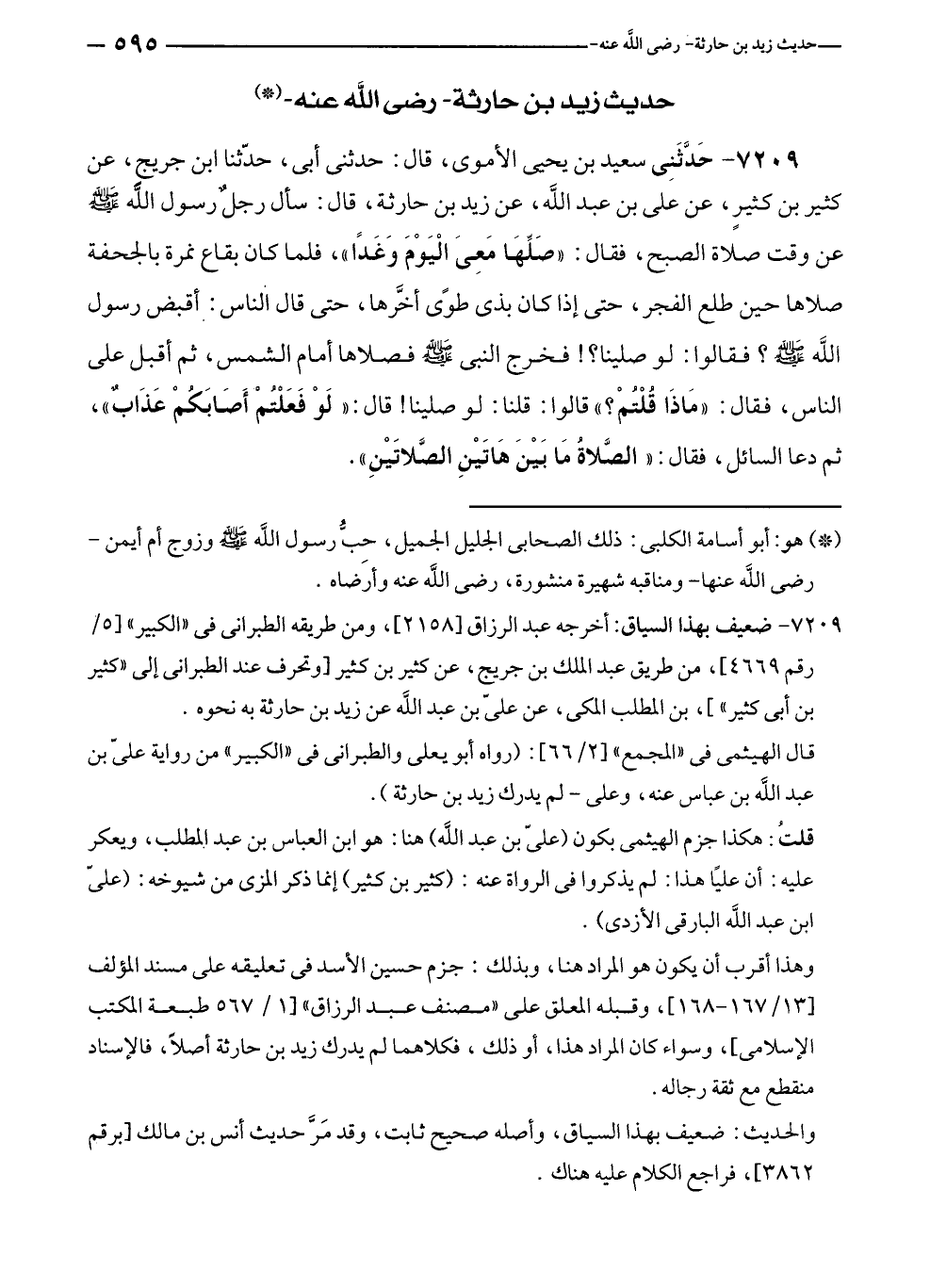 ٧٢٠٩ - حَدَّثَنِي سعيد بن يحيى الأموي، قال: حدثني أبي، حدّثنا ابن جريج، عن كثير بن كثيرٍ، عن علي بن عبد الله، عن زيد بن حارثة، قال: سأل رجلٌ رسول الله - صلى الله عليه وسلم - عن وقت صلاة الصبح، فقال: "صَلِّهَا مَعِىَ الْيَوْمَ وَغَدًا"، فلما كان بقاع نمرة بالجحفة صلاها حين طلع الفجر، حتى إذا كان بذى طوًى أخَّرها، حتى قال الناس: أقبض رسول الله - صلى الله عليه وسلم -؟ فقالوا: لو صلينا؟! فخرج النبي - صلى الله عليه وسلم - فصلاها أمام الشمس، ثم أقبل على الناس، فقال: "مَاذَا قُلْتُمْ؟ " قالوا: قلنا: لو صلينا! قال: "لَوْ فَعَلْتُمْ أَصَابَكُمْ عَذَابٌ"، ثم دعا السائل، فقال: "الصَّلاةُ مَا بَيْنَ هَاتَيْنِ الصَّلاتَيْنِ".